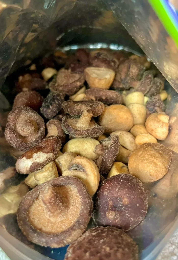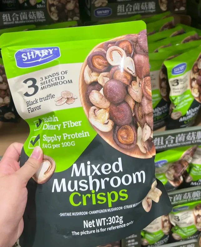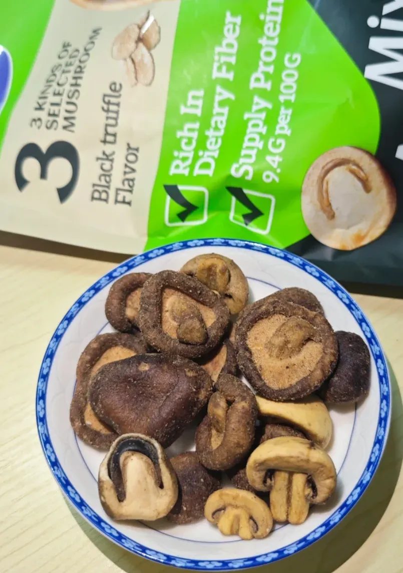 菌菇爱好者必冲的宝藏零食!一袋集齐香菇、双孢菇、草菇三种菌菇,用料超实在,每一颗都完整饱满,肉厚扎实。采用低温烘焙工艺,非油炸更健康,表面裹着淡淡黑松露调味料,咸香入味,鲜上加鲜。咬下去 “咔嚓” 一声,脆度拉满,完全不油腻,菌菇的天然鲜香混合黑松露的独特香气,越嚼越上头,比薯片还解馋。