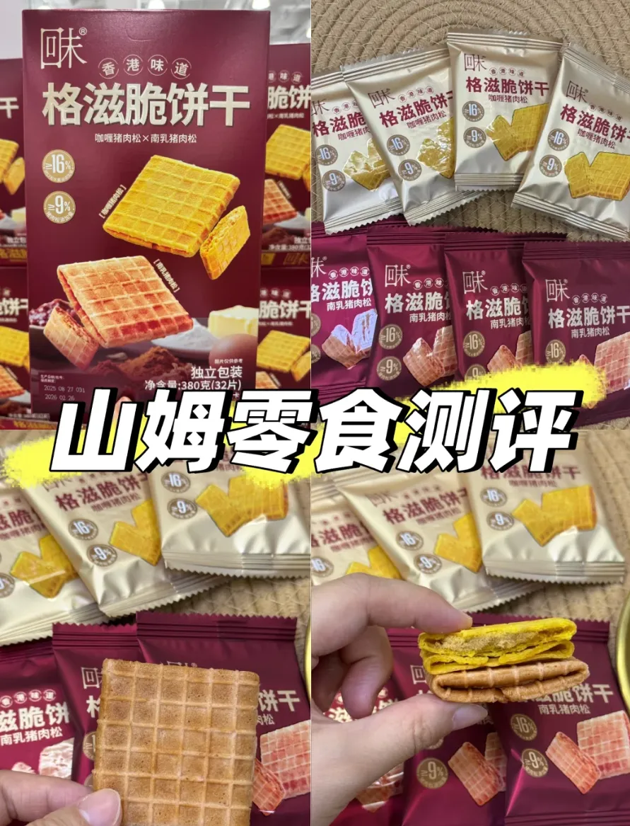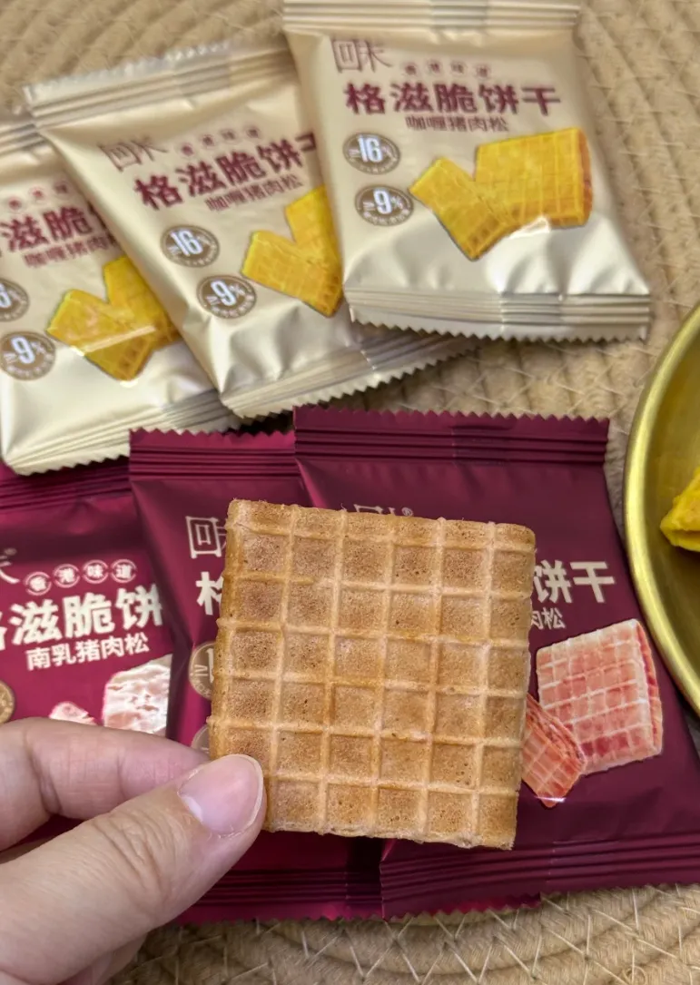 肉松脑袋直接狂喜!香港风味的酥脆饼干,有南乳猪肉松和咖喱猪肉松两种口味,每款都超惊艳。华夫格造型的饼干外壳,像蛋卷一样酥脆到掉渣,添加≥16% 进口新西兰无水黄油,黄油香超浓郁,还带着淡淡蛋香。夹心裹着≥9% 的金丝猪肉松,纤维细腻不柴,咸香十足。