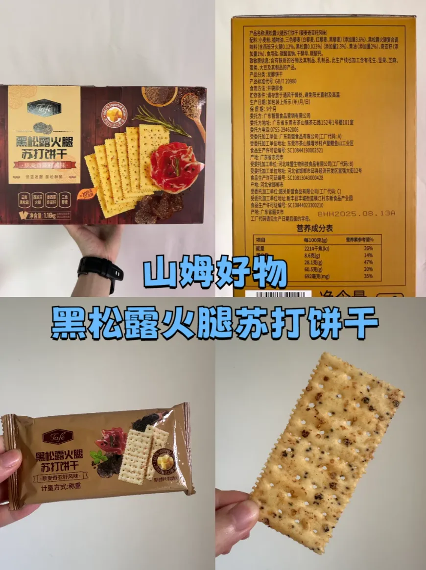 苏打饼干的奢华升级版,咸香党的本命!一开袋就闻到浓郁黑松露香气,混合着火腿咸香,超诱人。薄脆饼干上嵌着清晰的西班牙火腿丁,还添加了三色藜麦和奇亚籽,口感更丰富,咬下去酥脆干爽,带着微微颗粒感,多重风味层层迸发。