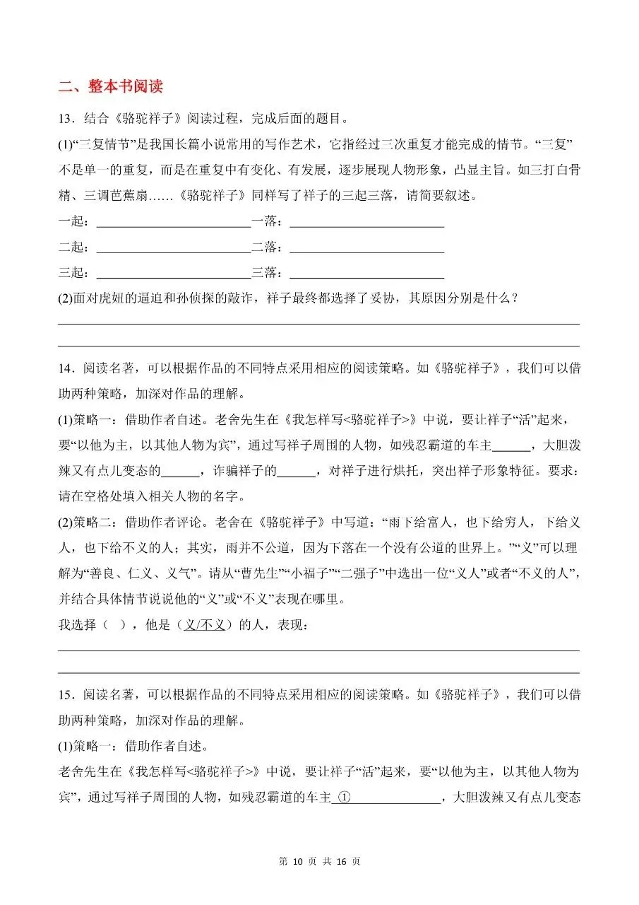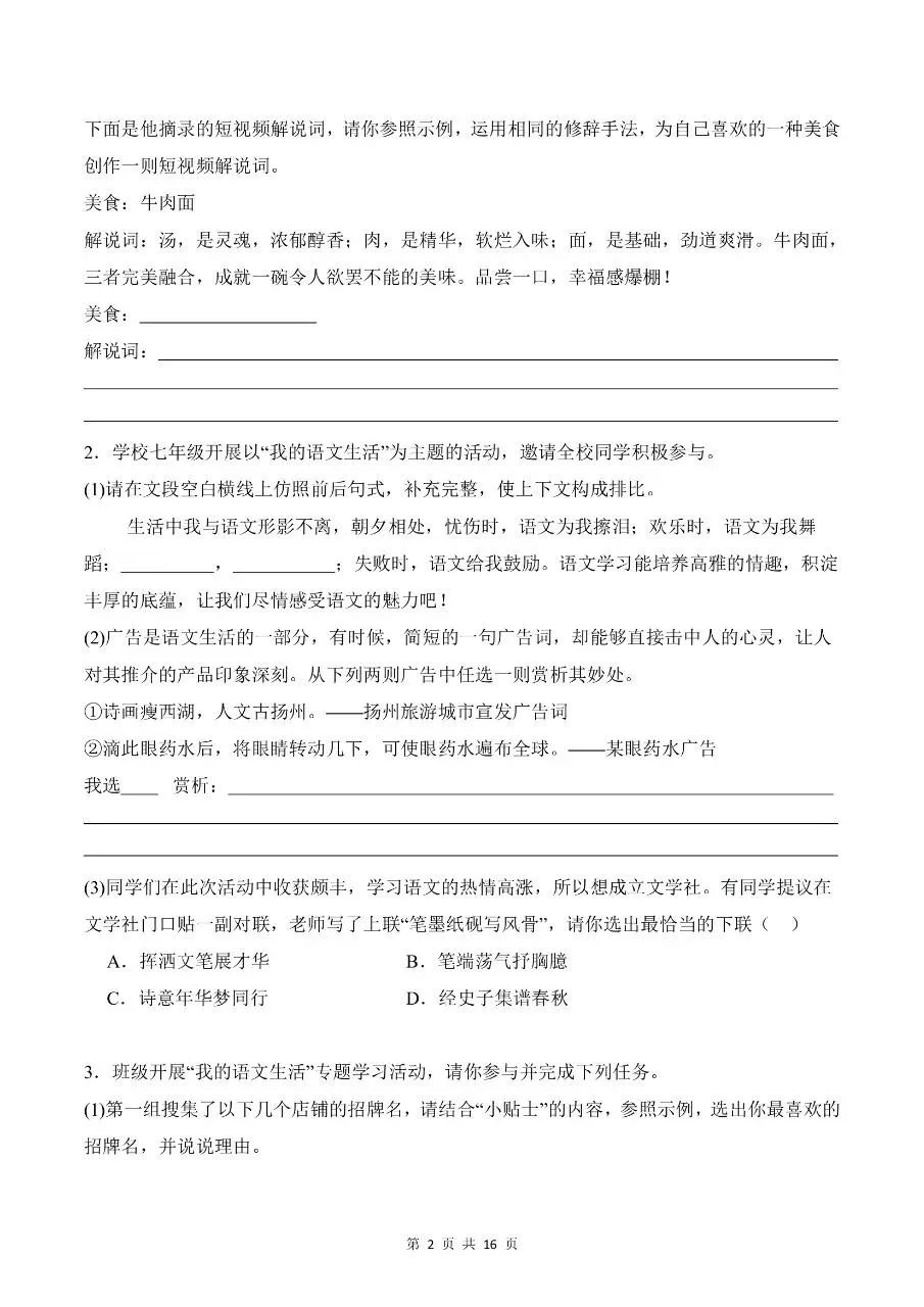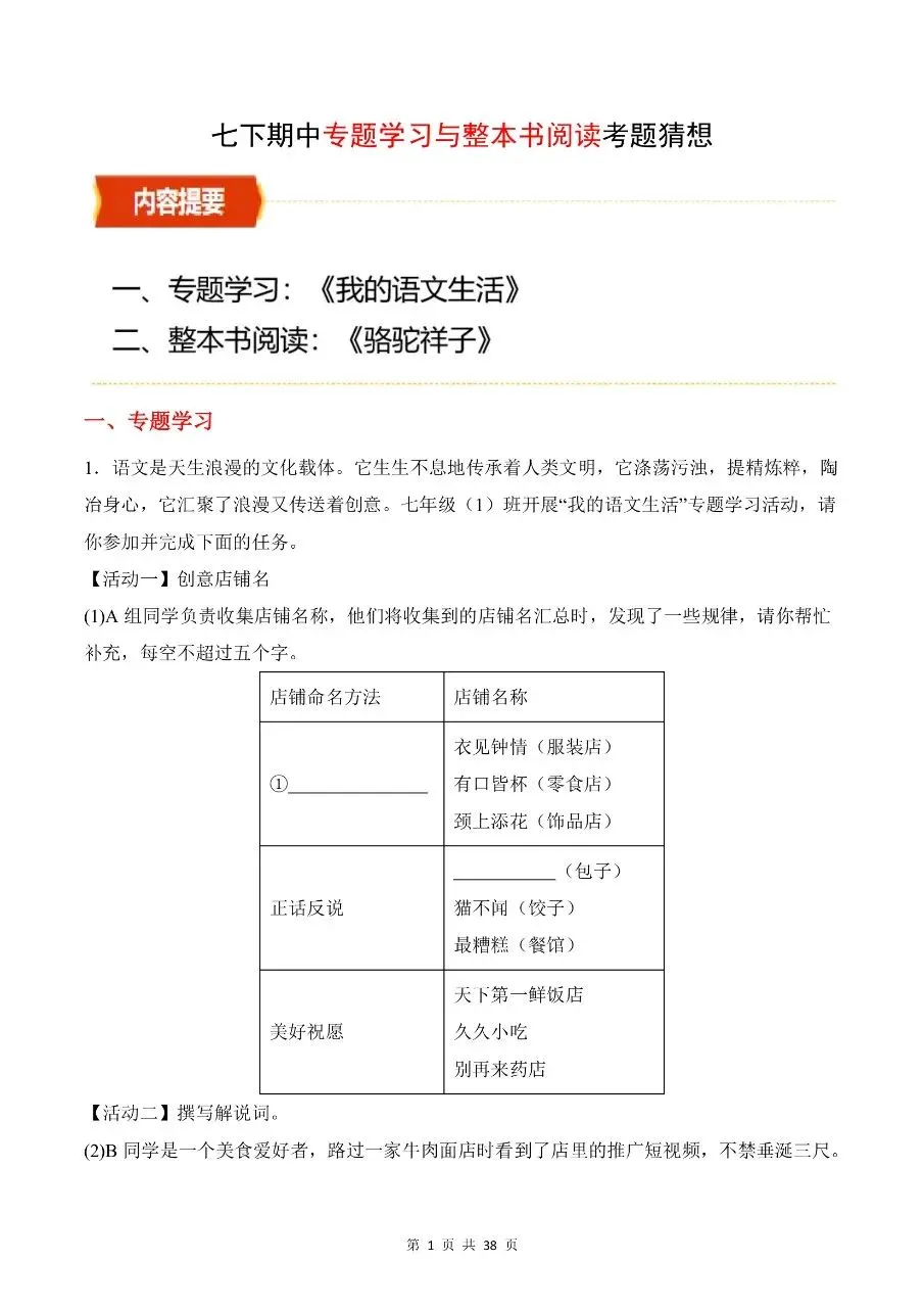 2026年春新版七年级下册人教版语文期中考试复习专题学习《我的语文生活》+整本书阅读《骆驼祥子》,完整电子版含答案