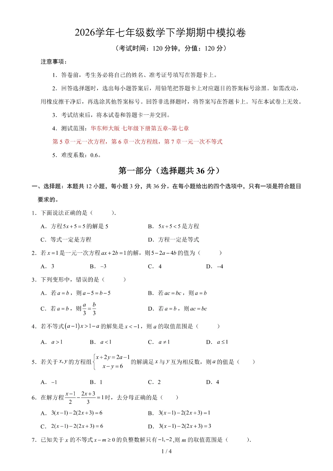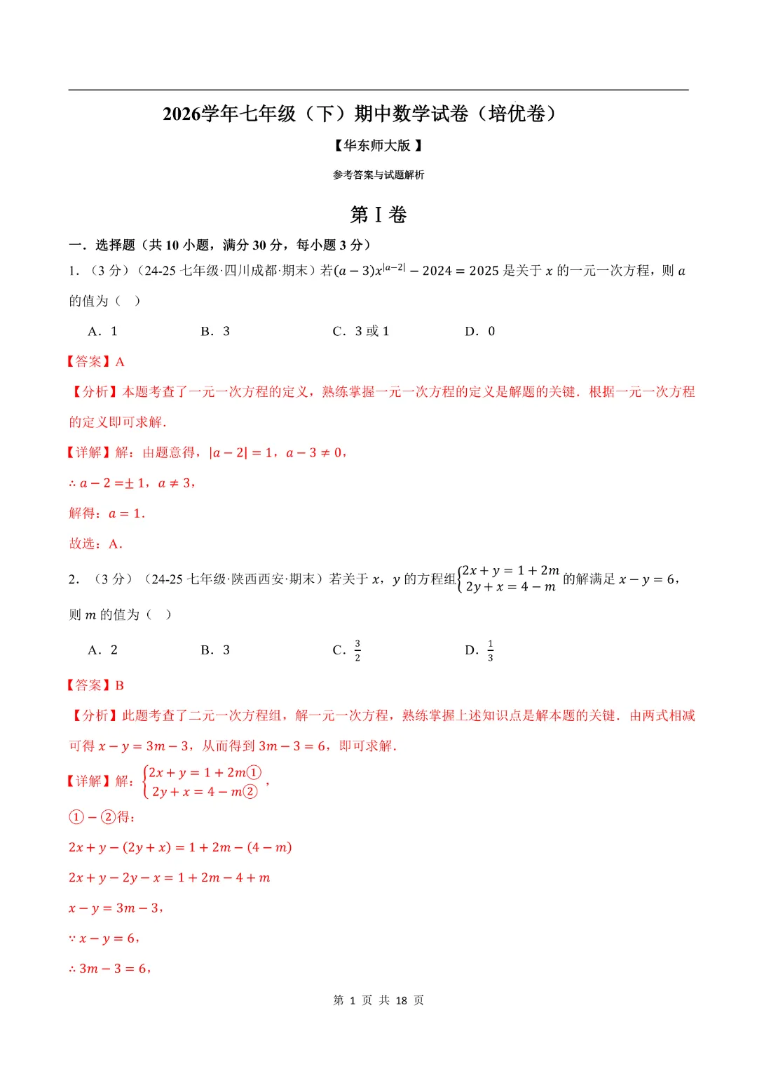 今天给大家分享的是:【七年级下册数学】【华东师大版】期中测试卷2套带答案解析|完整高清电子版可打印