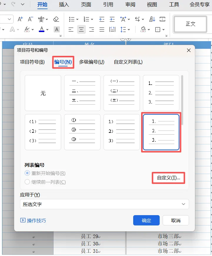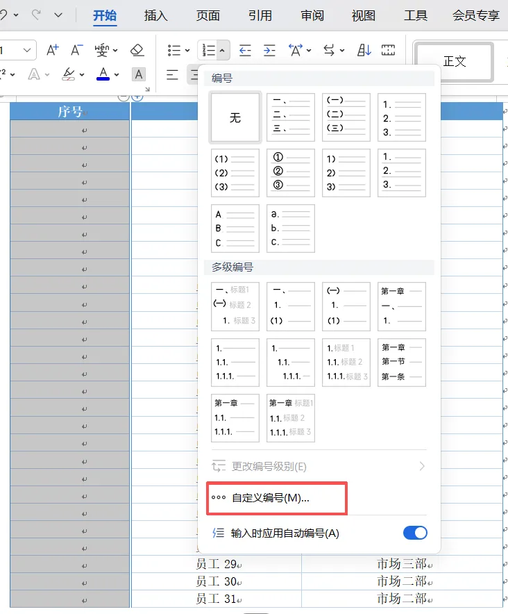 2、选择编号→自定义编号