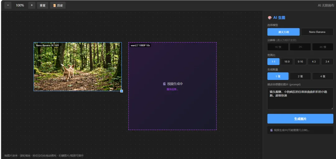 先说一下哈,里面生图调用香蕉模型,一张图1毛钱;视频的话,调用的是wan 2.7,每个月送50条视频。