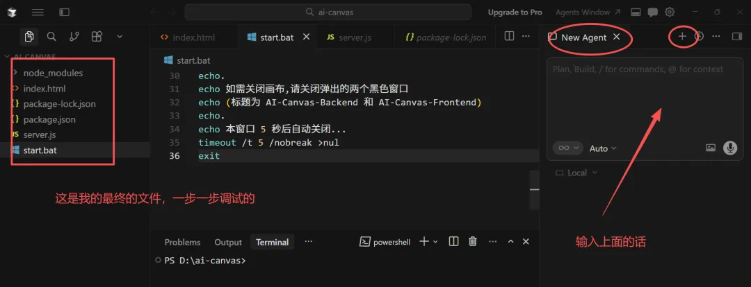 过一段时间,这个cursor的编程Agent就会生成两个文件,一个是server.js;一个网页的html。