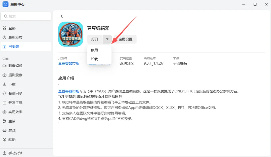 升级飞牛以后,一定要去执行飞牛云豆豆编辑器的修复操作,这样才能恢复使用。