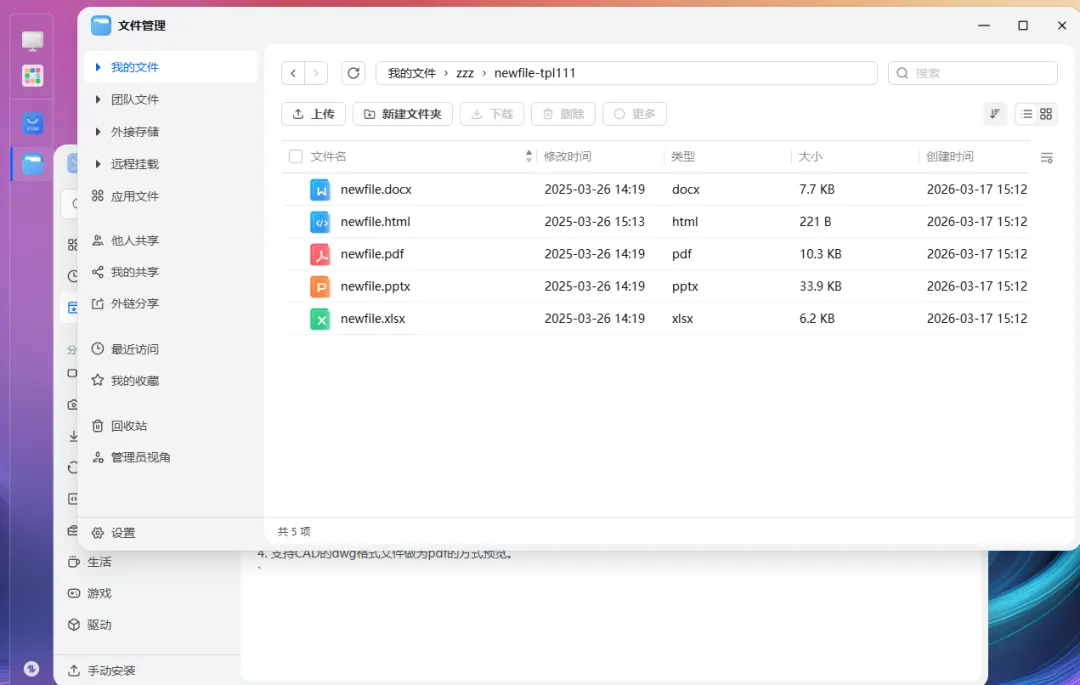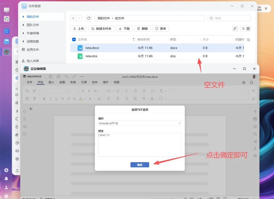 b.在本地新建空文件,后缀名改完docx或者xlsx,上传到飞牛即可.