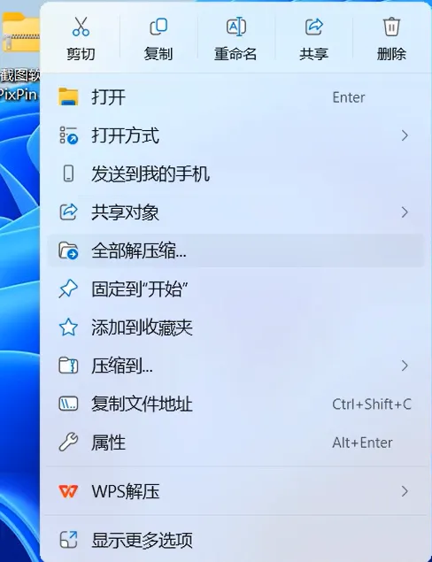2.1,鼠标右击【截图软件PixPin 1.9(64bit)】压缩包(Win11系统需先点击“显示更多选项”)选择【全部解压缩】。如下图: