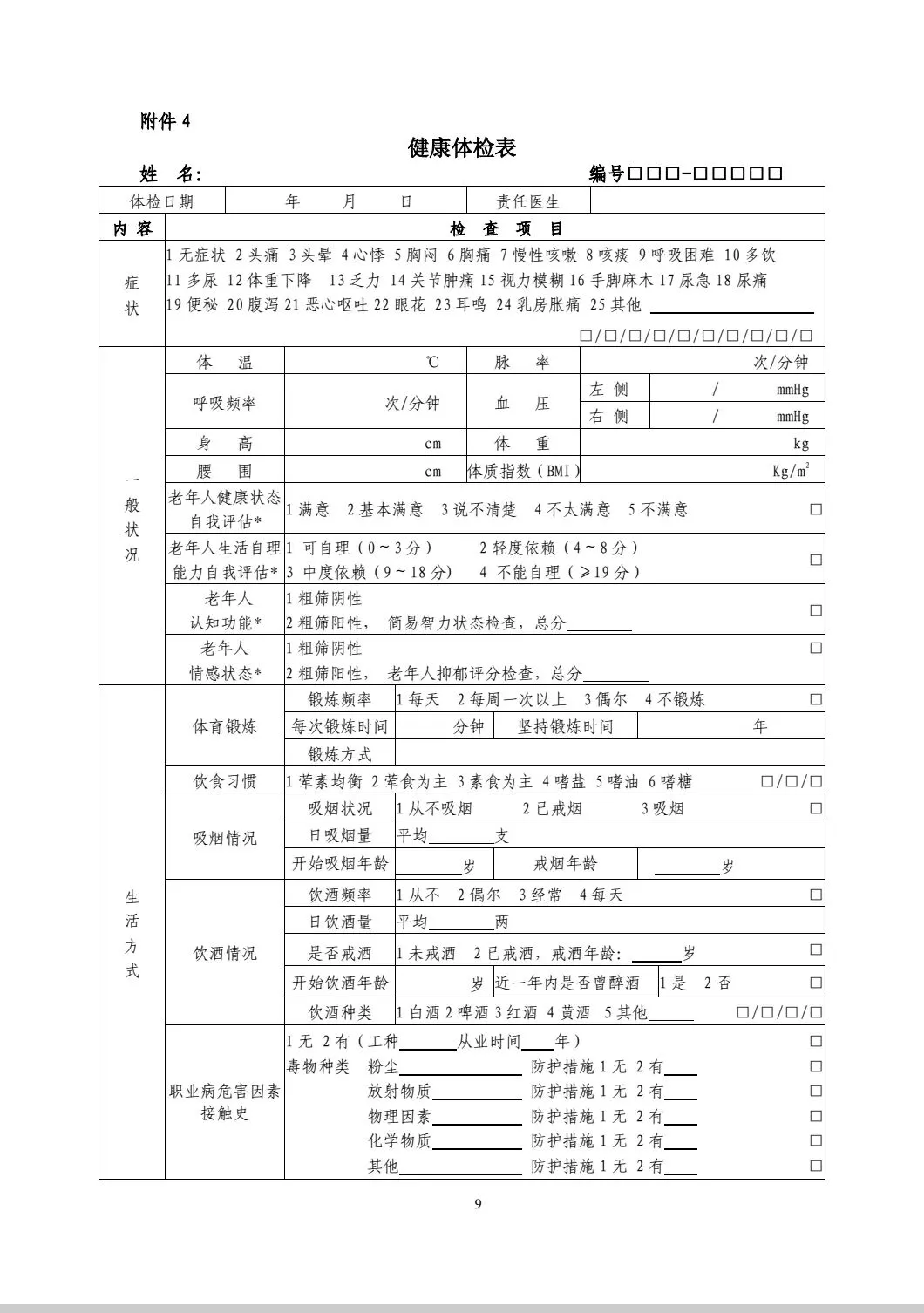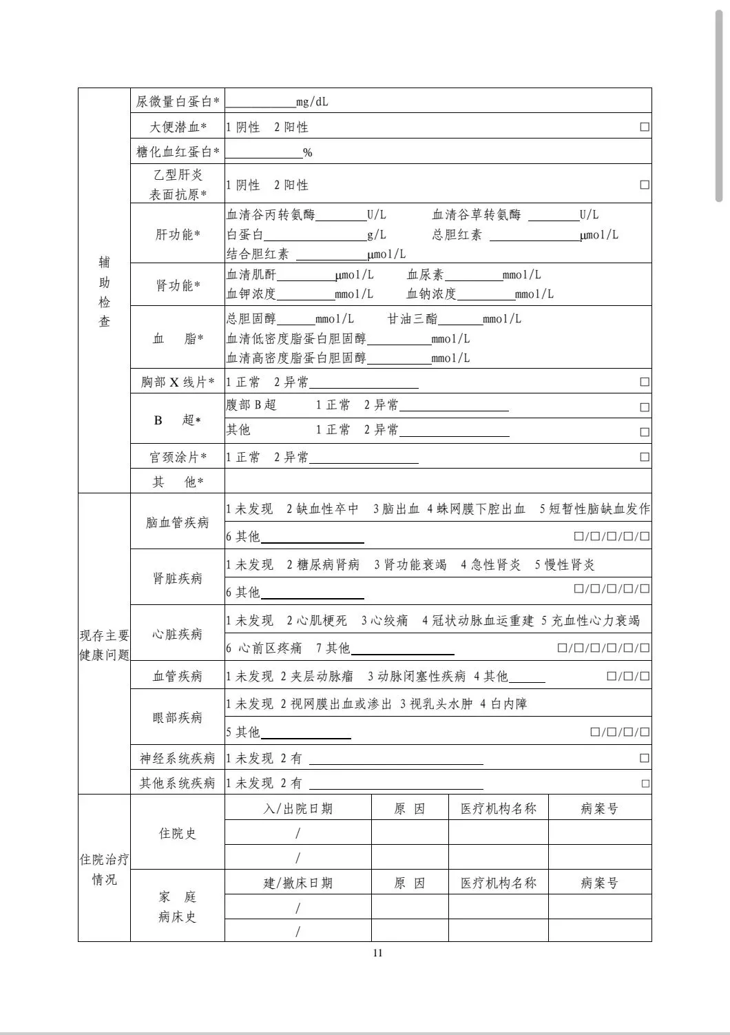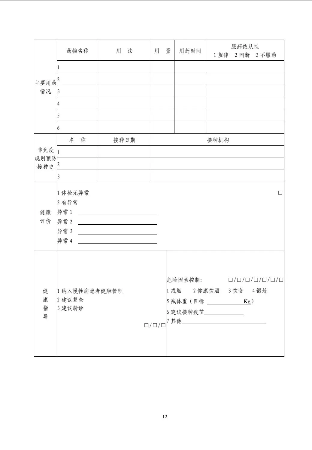 1.本表用于老年人、高血压、2 型糖尿病和严重精神障碍患者等的年度健康检查。一般居民的健康检查可参考使用,肺结核患者、孕产妇和 0-6 岁儿童无须填写该表。