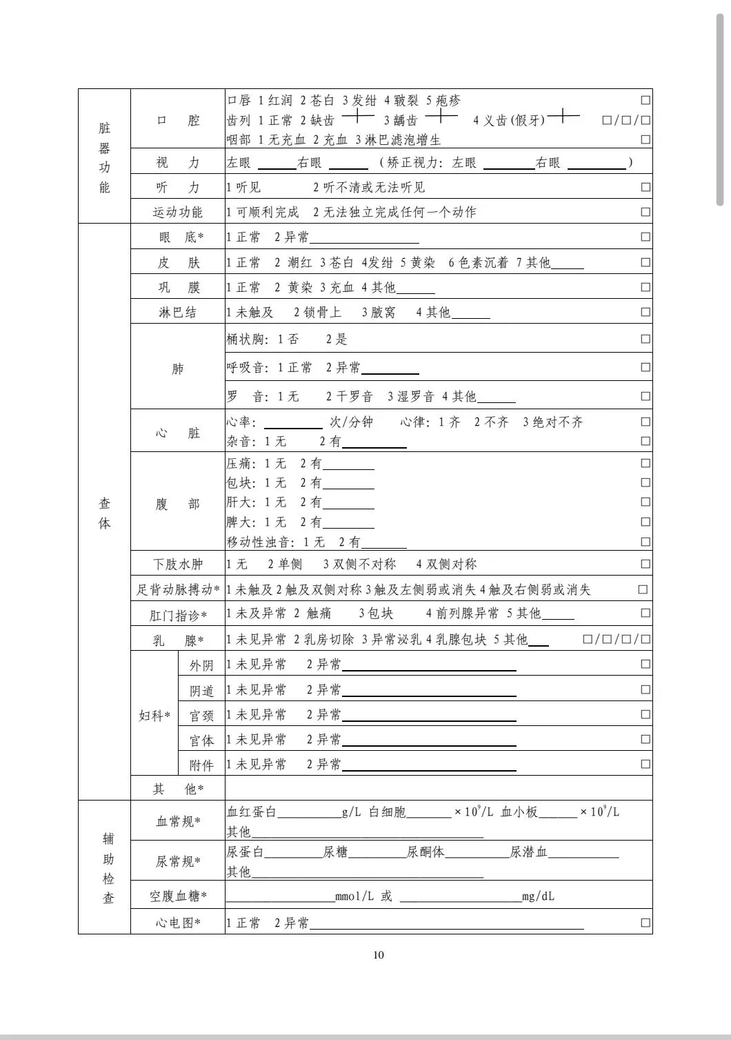2.表中带有*号的项目,在为一般居民建立健康档案时不作为免费检查项目,不同重点人群的免费检查项目按照各专项服务规范的具体说明和要求执行。对于不同的人群,完整的健康体检表指按照相应服务规范要求做完相关检查并记录的表格。