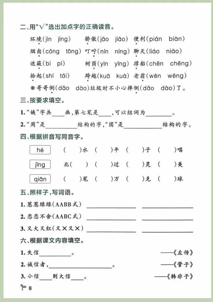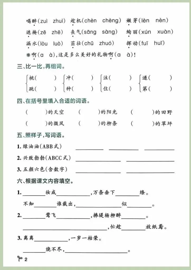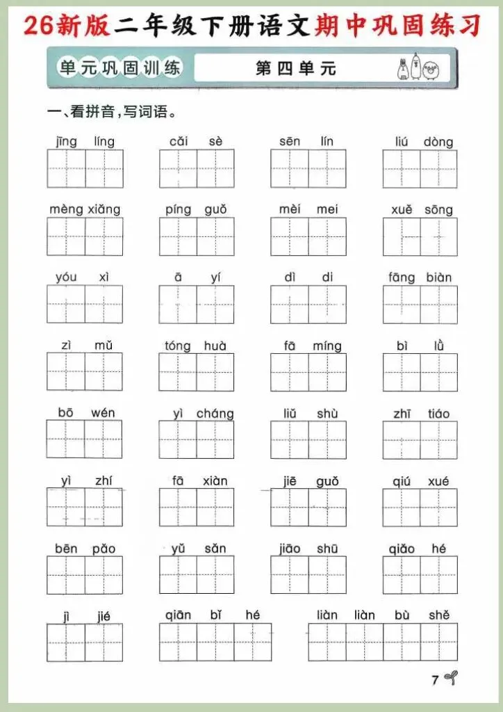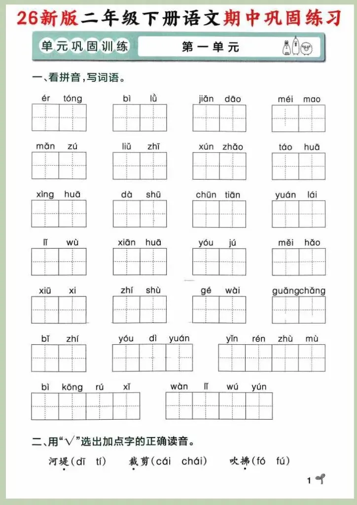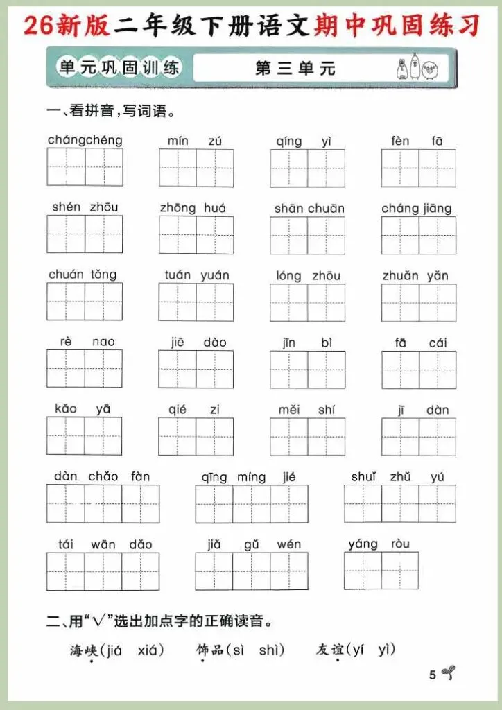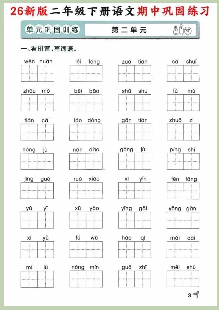 26新版二年级下册语文期中巩固练习(电子版可打印) 点击蓝字关注我们吧 今天涵涵的学霸日记给大家分享的是二年级下册语文期中期中巩固练习,包含了看拼音写词语,选出正确的读音,比一比再组词,在括号里填上正确的词,找样子写词语,根据课文内容填空等六大期中巩固练习,家长抓紧打印给孩子练习 (温馨提示:文末有完整版领取) 领取电子版如下: 第一步:请点击“点赞👍”➕“❤️” 第二步:关注公众号后在对话窗口点私信回复关键词: 110即可领取!