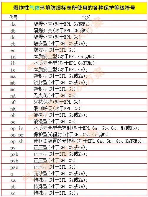 1、爆炸性气体环境防爆标志 所使用的各种保护等级符号: