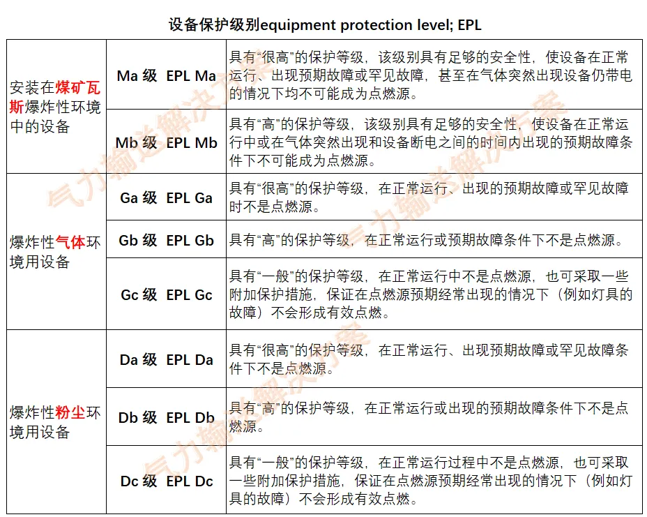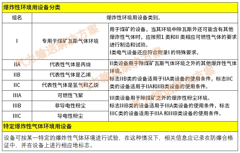 根据设备成为点燃源的可能性和爆炸性气体环境、爆炸性粉尘环境及煤矿瓦斯爆炸性环境所具有的不同特征而对设备规定的保护等级。共有三大类8种级别: