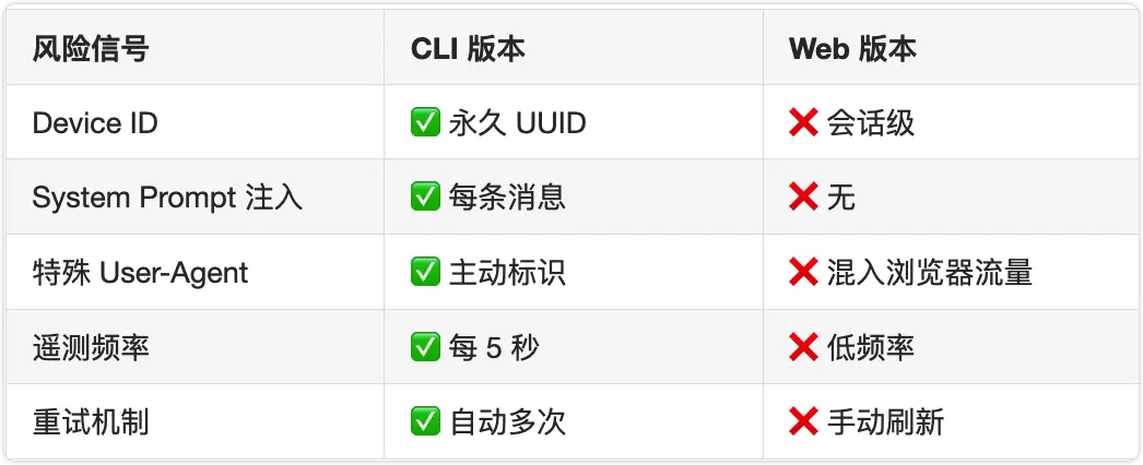 第二,CLI 版本的设计天然比 Web 版暴露了多得多的风控信号。 不是因为你用的猛,而是软件本身就在”卖”。