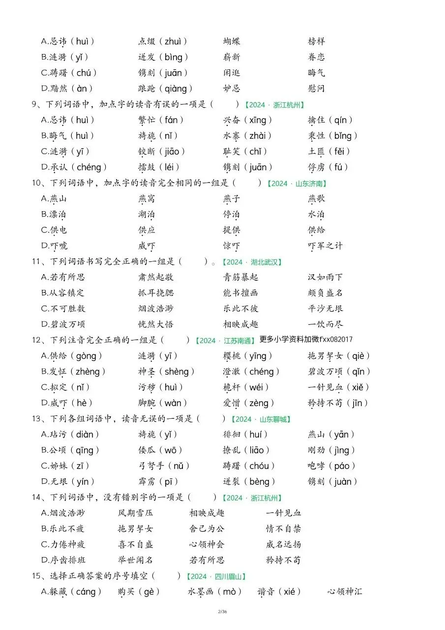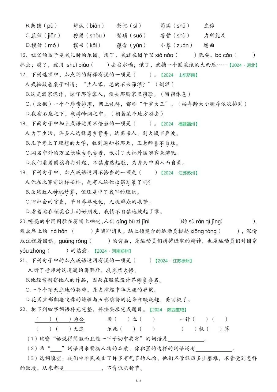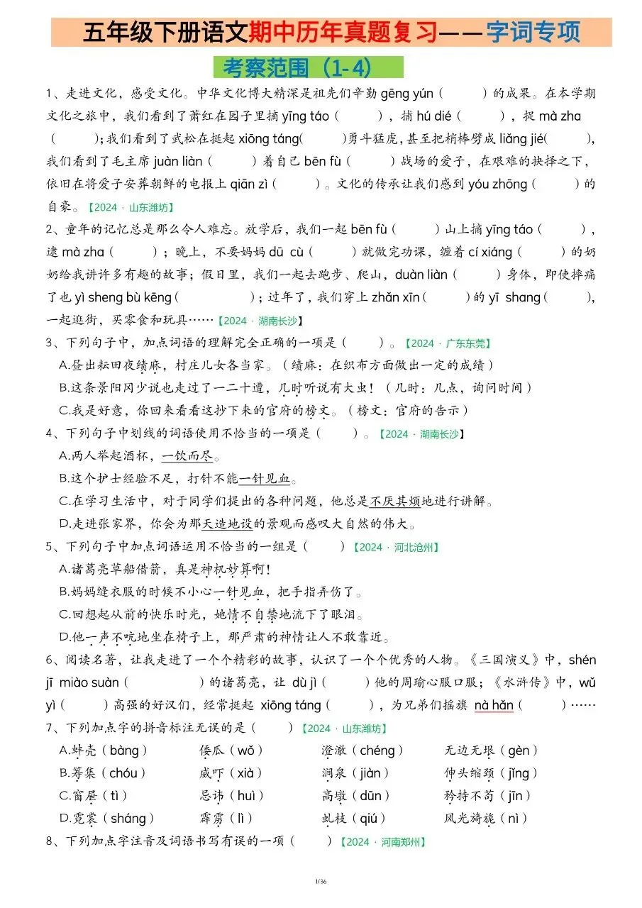 涵盖字词、选择、填空、古诗名言、句子改写、快乐读书吧(四大名著)六大专项,全部选自各地真题,附完整答案,聚焦字音字形、词语运用、课文理解、古诗默写、名著常识与句式变换,适合期中冲刺复习。