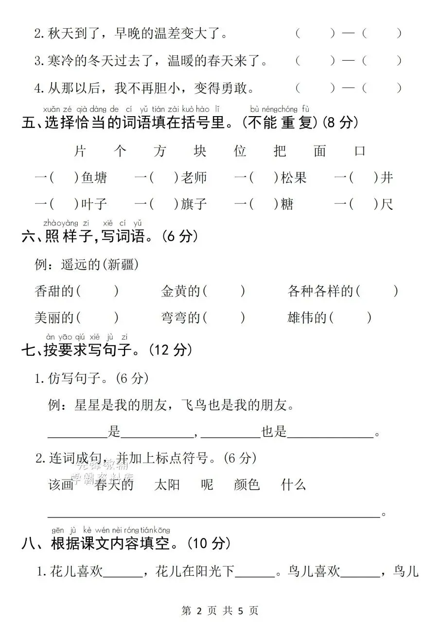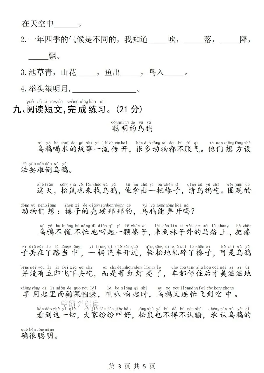 满分100分、时长60分钟,含字母连线、看拼音写词语、照样子写字、反义词、量词填空、仿写词语句子、课文填空、阅读理解《聪明的乌鸦》、看图写话十大题型,附完整参考答案。