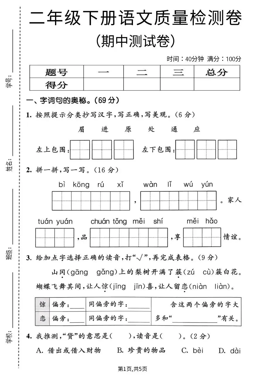 二年级下册语文|期中测试卷(附答案)(可下载打印)
