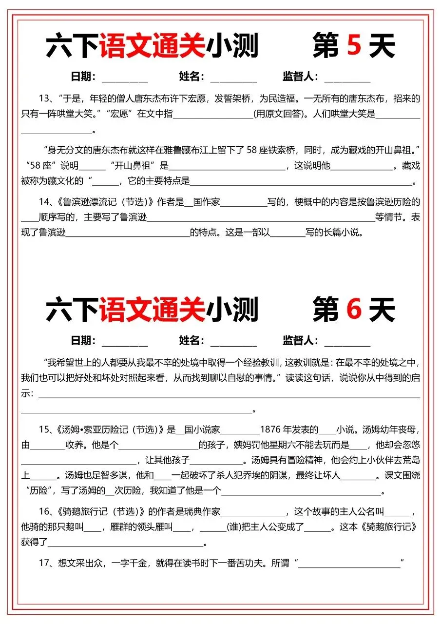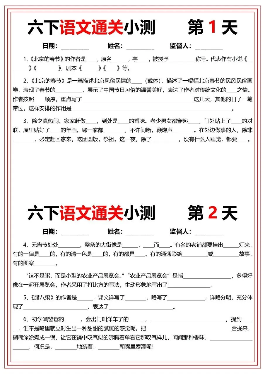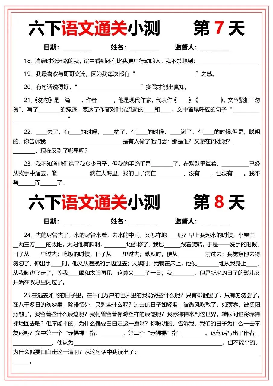 六年级下册语文|通关小测(22天)(可下载打印)