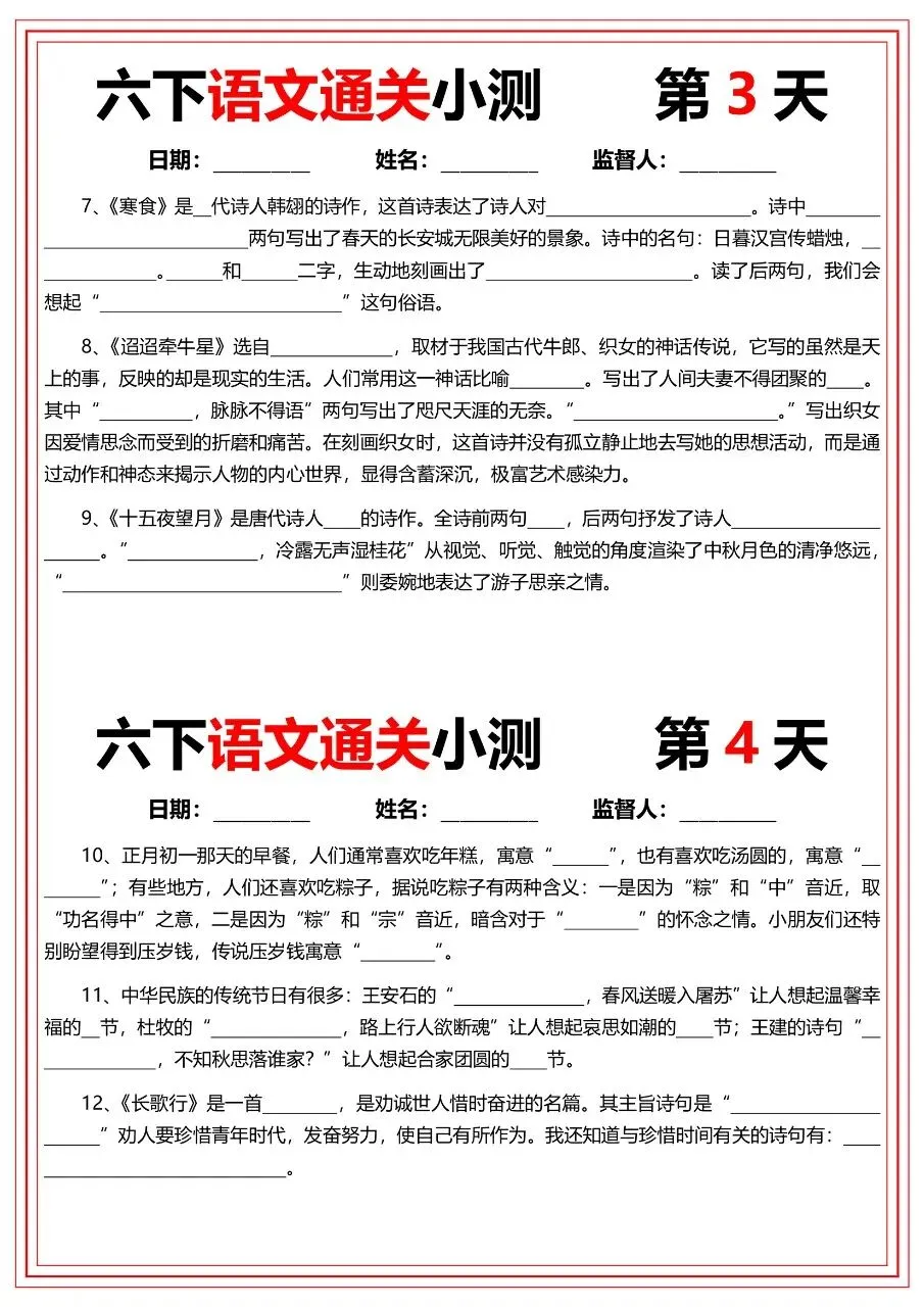 按天编排,覆盖课文核心知识点、古诗、文言文、名言警句、文学常识与课文理解,含《北京的春节》《匆匆》《为人民服务》等重点篇目,配套古诗默写、课文填空、主旨感悟与必背名句,附完整答案,适合期末冲刺与每日巩固。