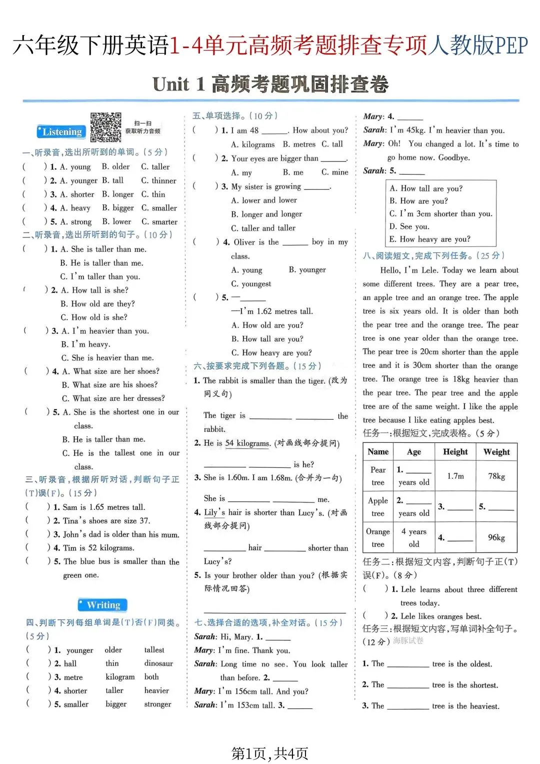 南星成长营今日给大家分享26年春新版六年级下册英语人教PEP版期中复习1-4单元高频考题排查专项练习,完整版含答案,电子版可打印!有需要的家长可以保存打印啦!