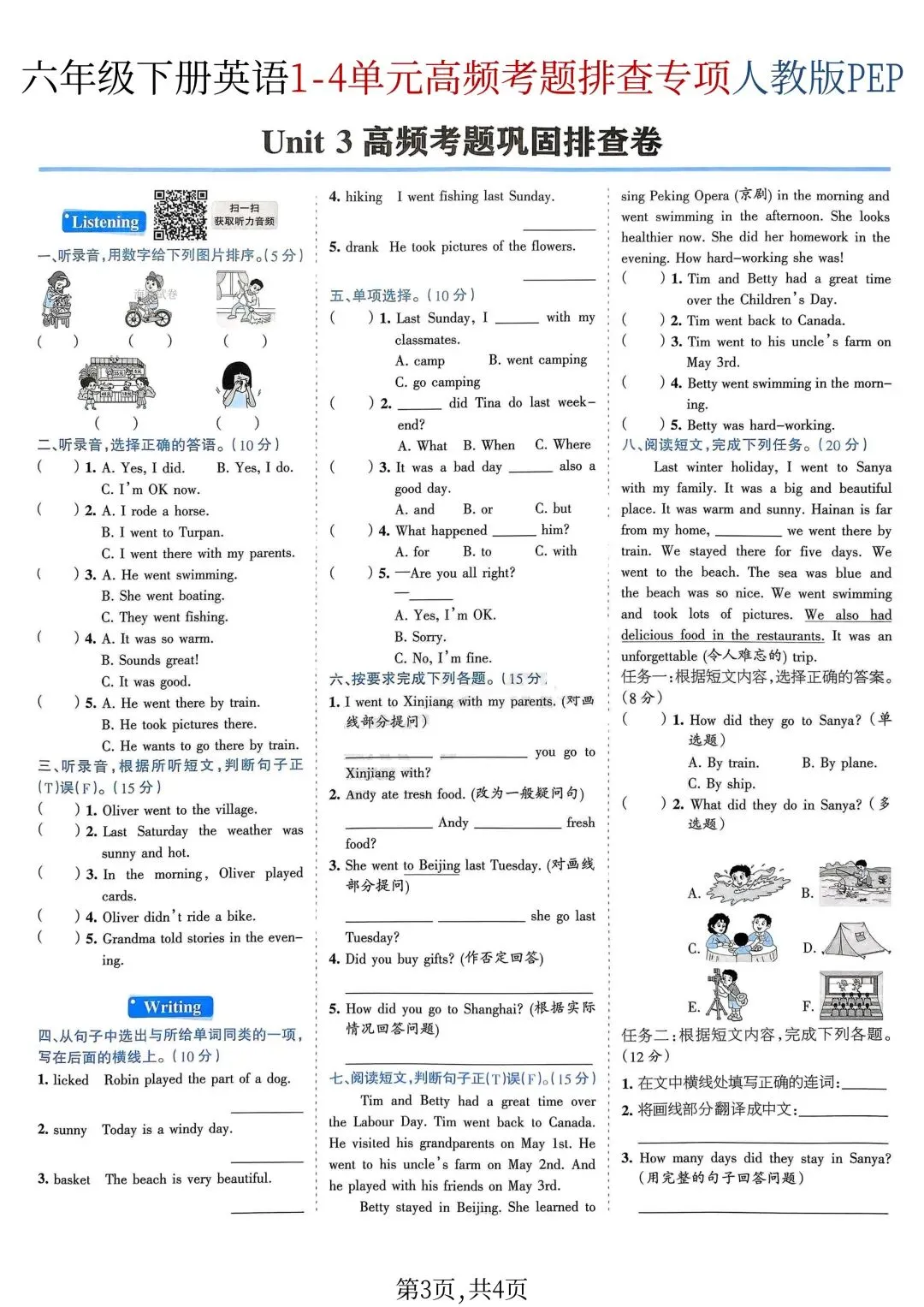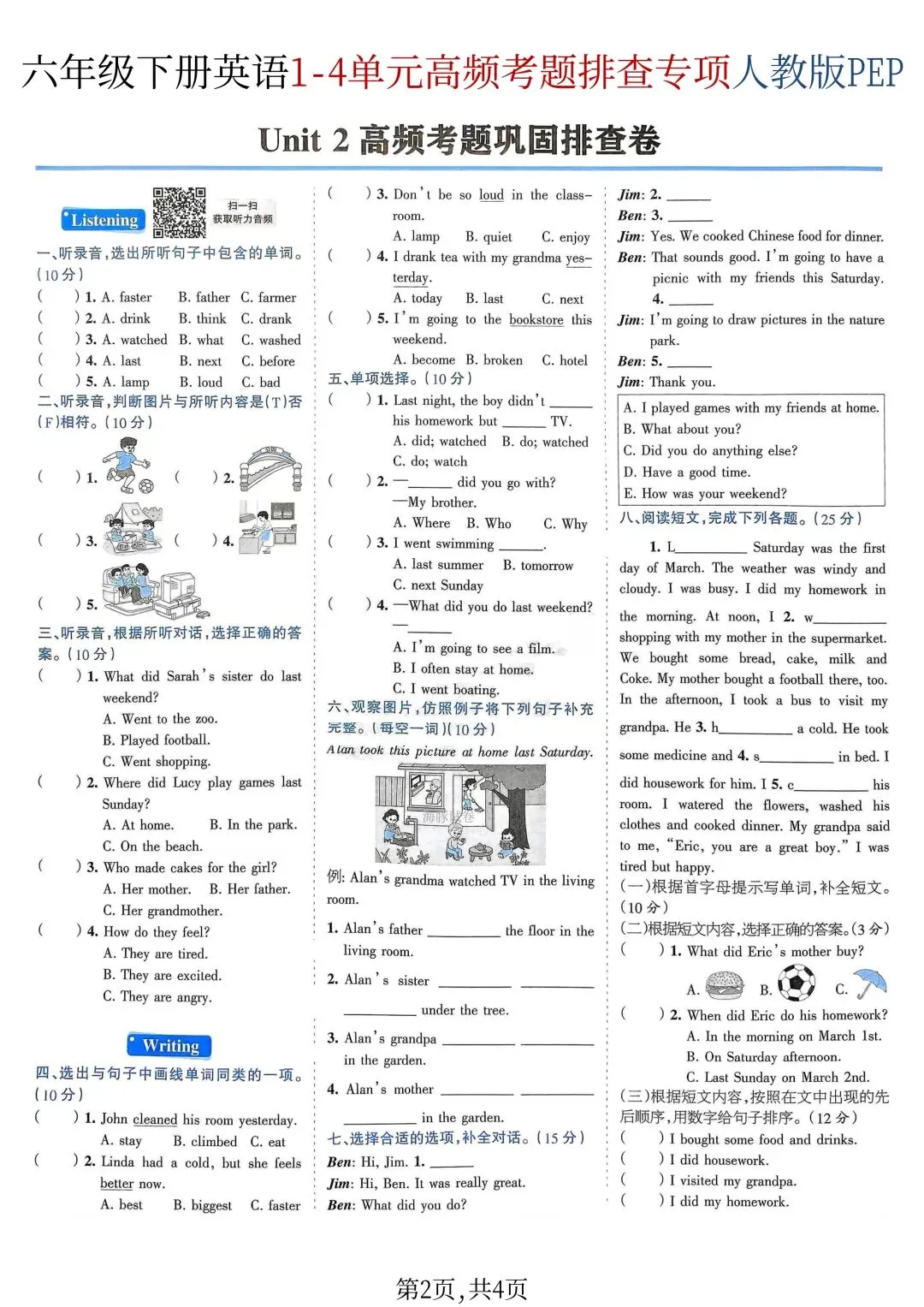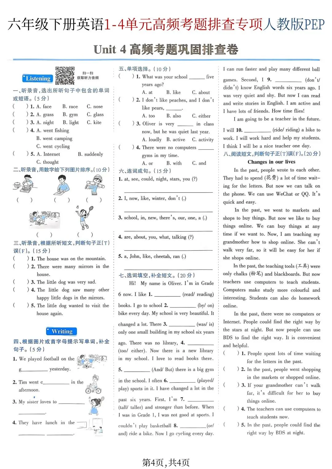26年春新版六年级下册英语人教PEP版期中复习1-4单元高频考题排查专项练习,完整版含答案,可打印