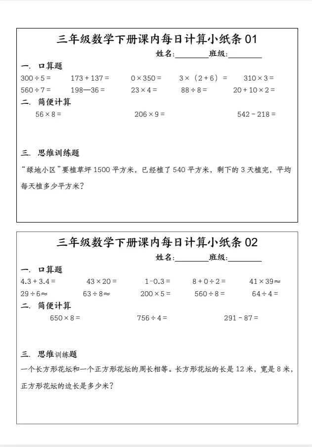 (可下载)三年级下册数学每日计算小纸条电子版