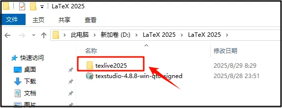 第三步:打开解压后的文件夹,找到【texlive2025】文件夹再打开。