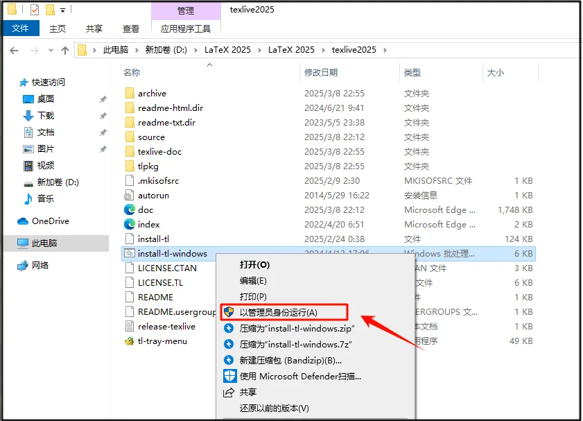 第四步:选中【install-tl-windows】右击【以管理员身份运行】。