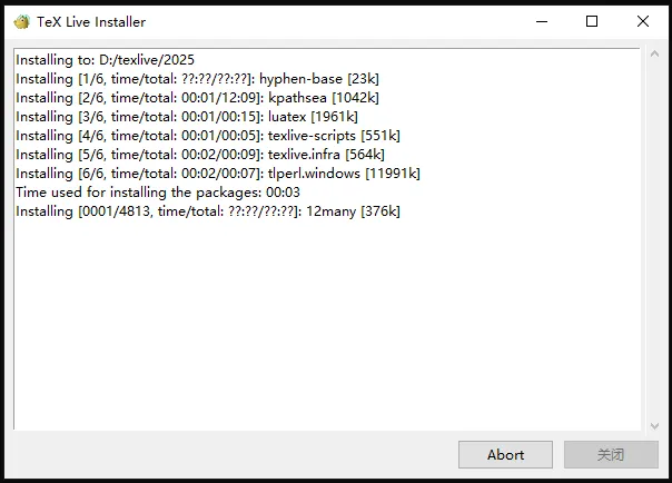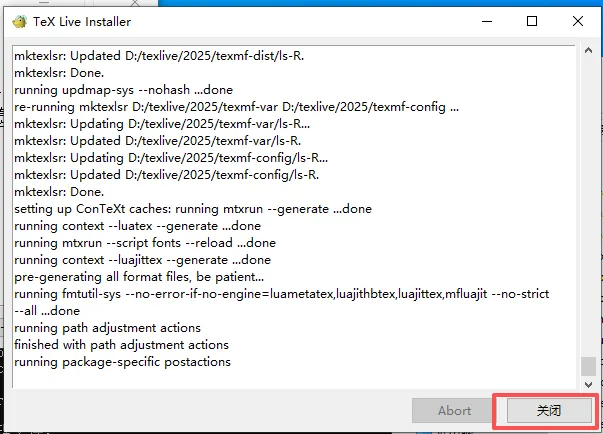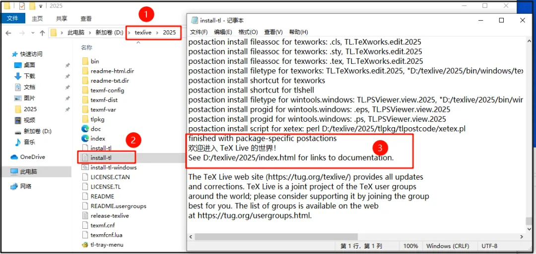 第十二步:打开安装目录【(步骤9)本案为:D:\texlive\2025】下的【install-tl】文件,如下图显示【欢迎进入……】为安装成功。