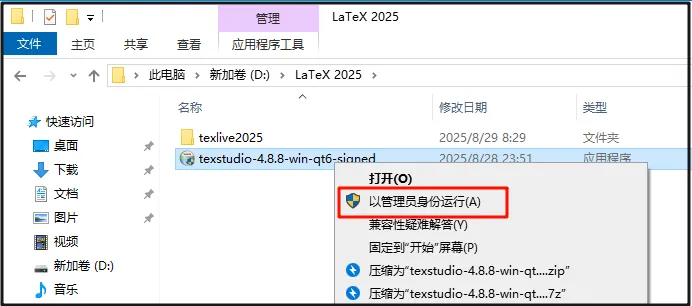 第十三步:返回第二步解压并打开的文件夹,找到【texstudio-4.8.8-win-qt6-signed】右击【以管理员身份运行】。