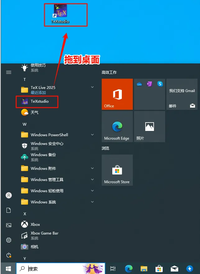 第十八步:点开始,找到刚刚安装的【TeXstudio】将其拖到电脑桌面。