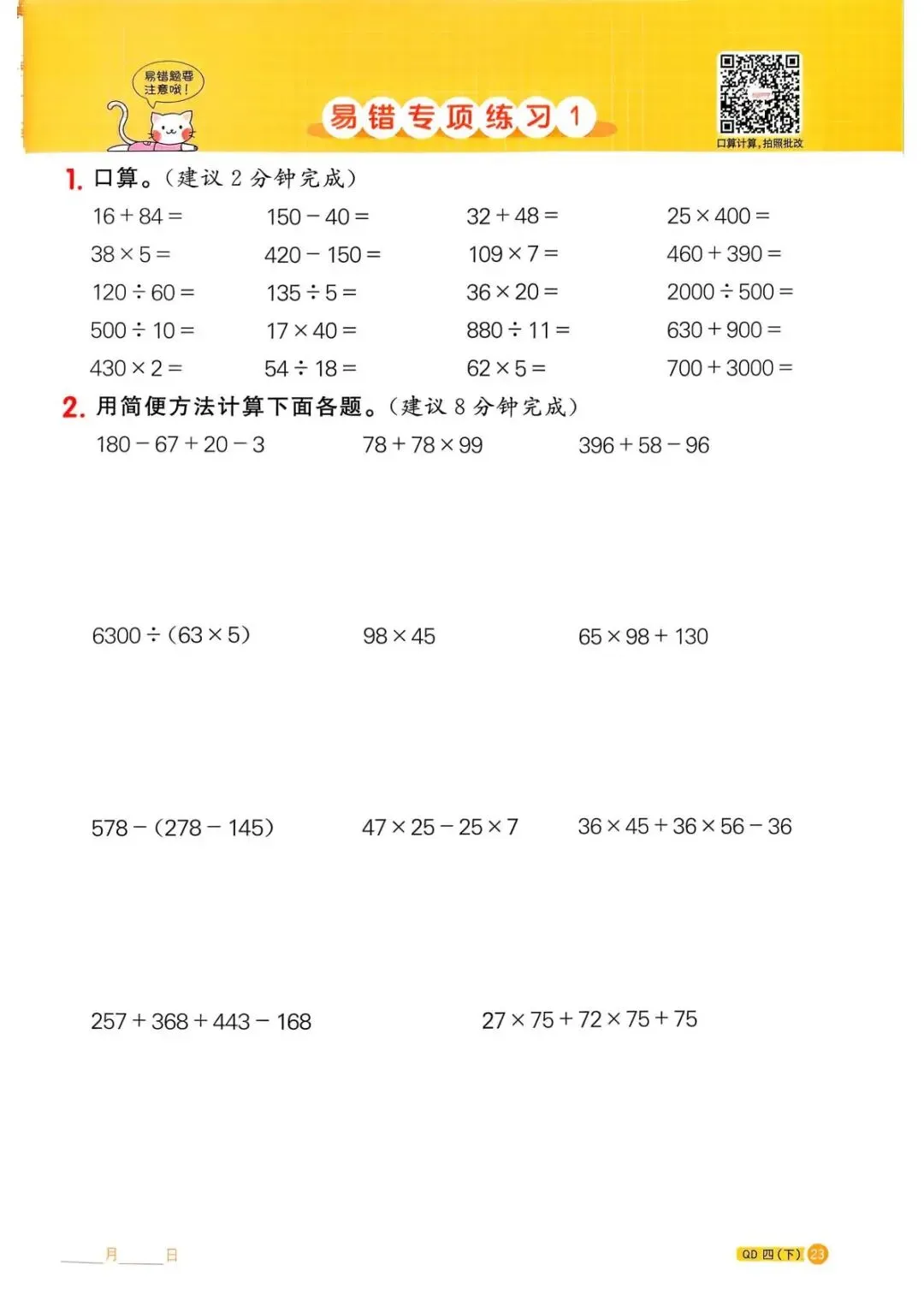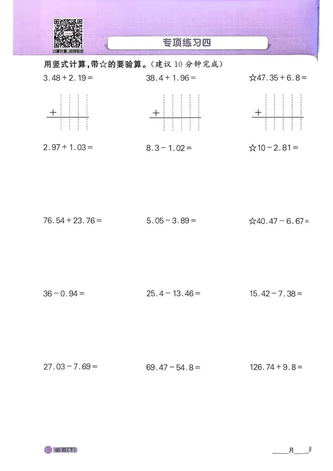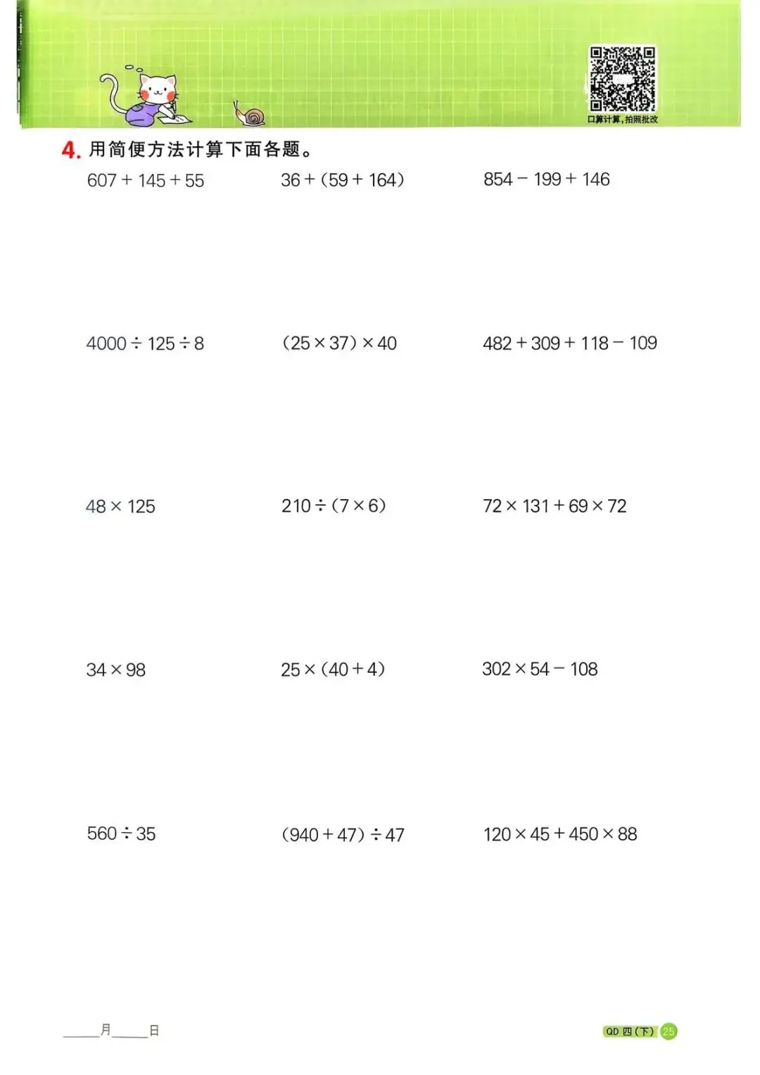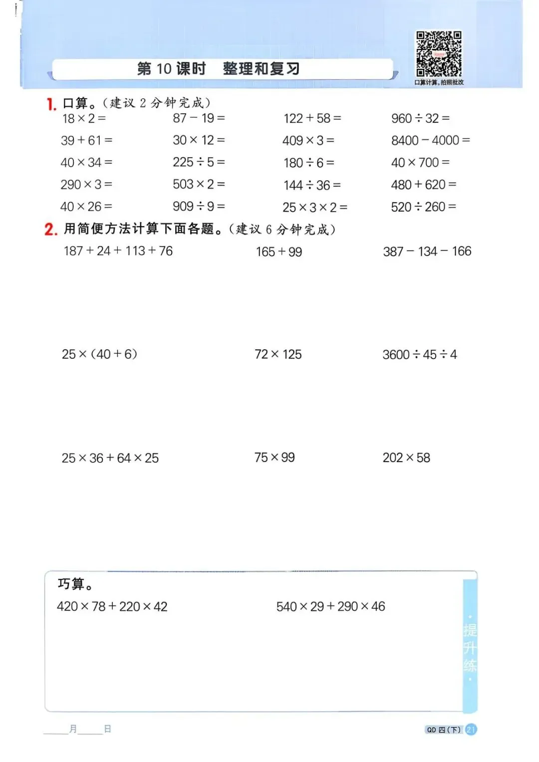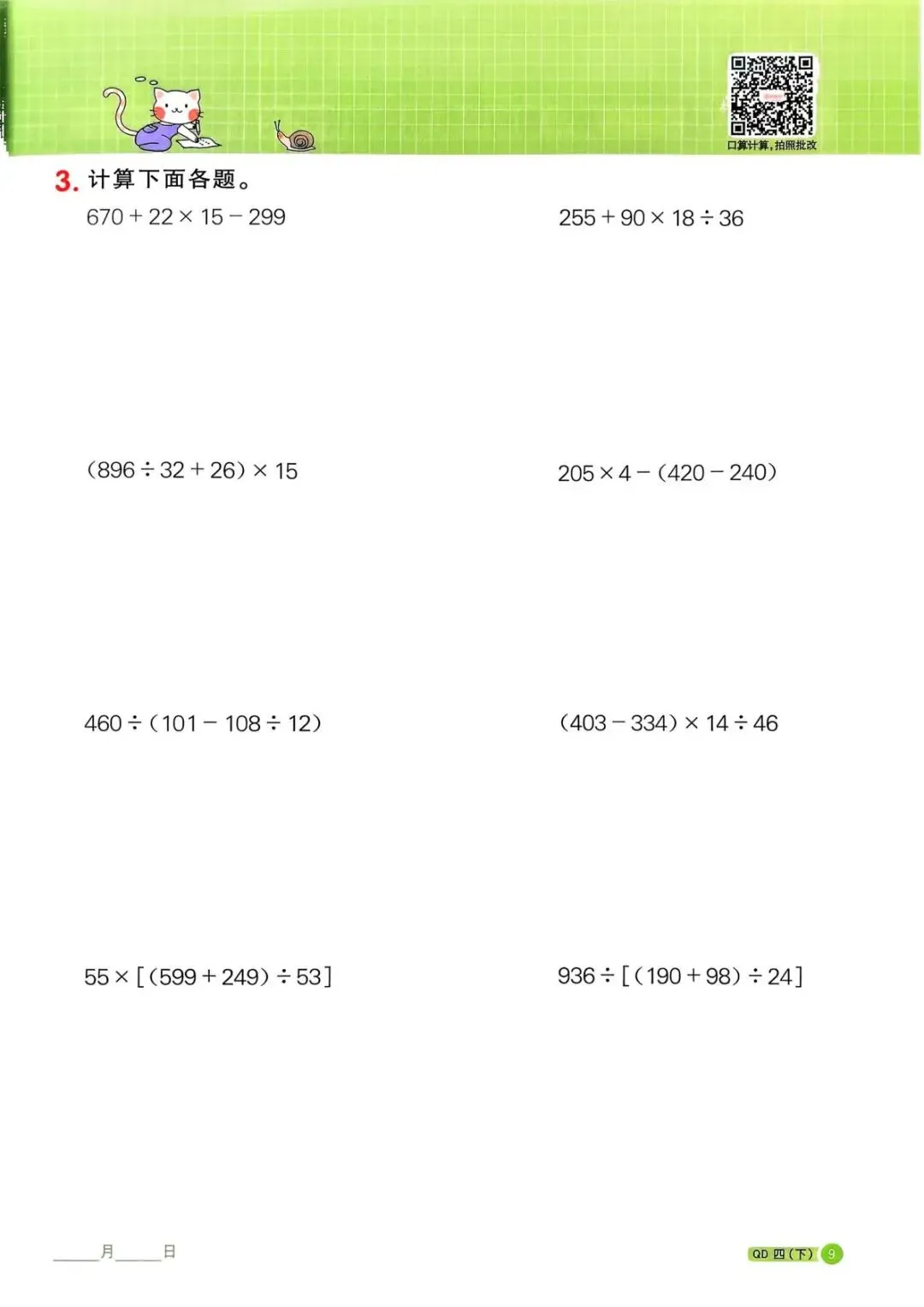 26春青岛版63数学四年级下册《口算+简便计算天天练》附答案| 高清可打印.口算竖式提升练习
