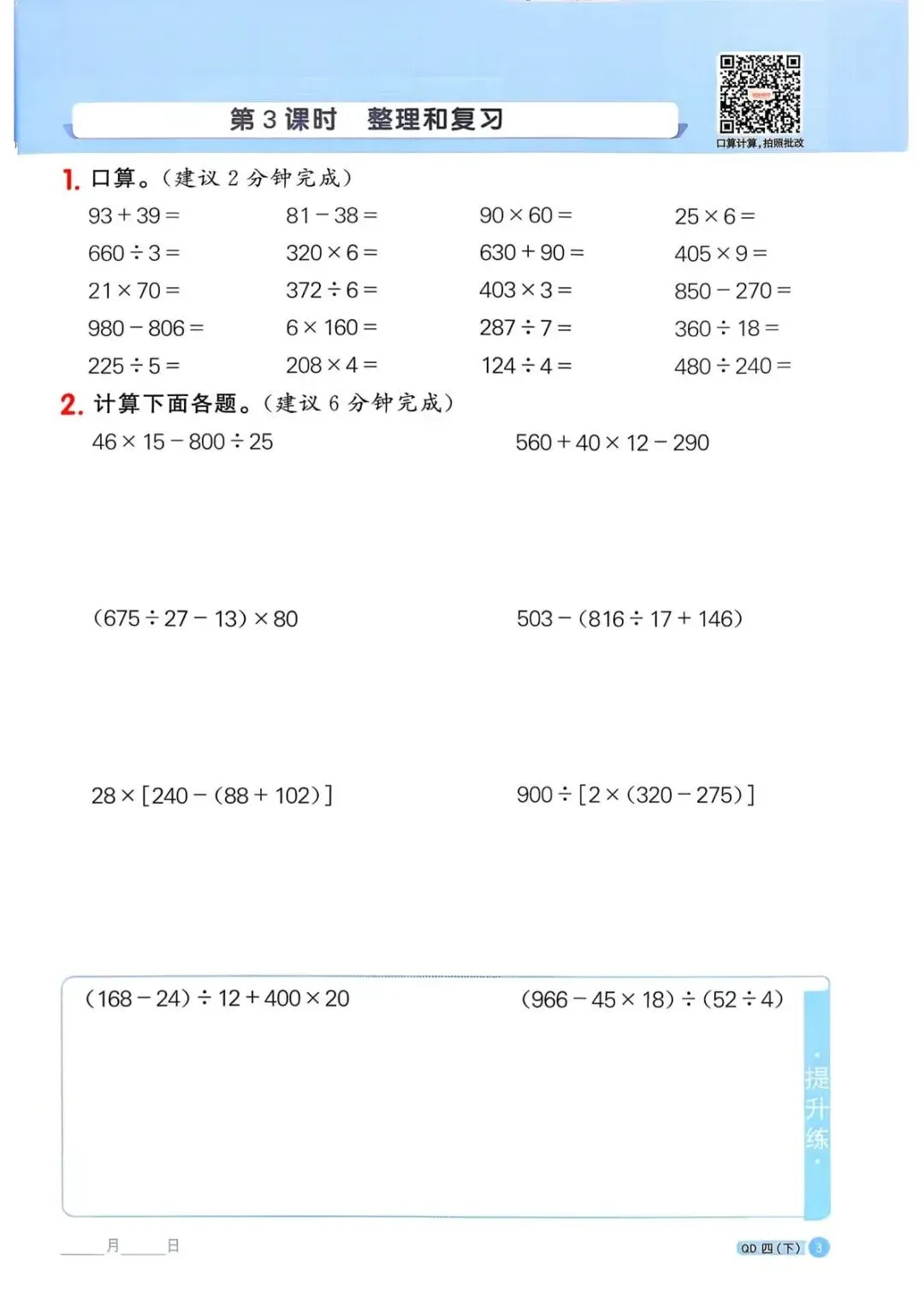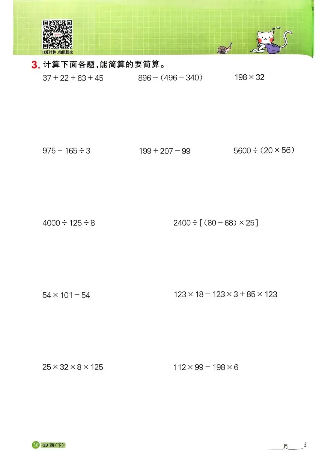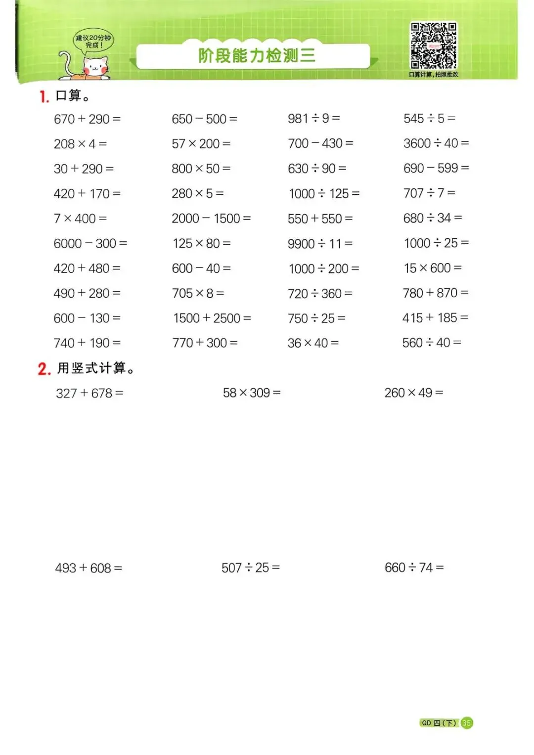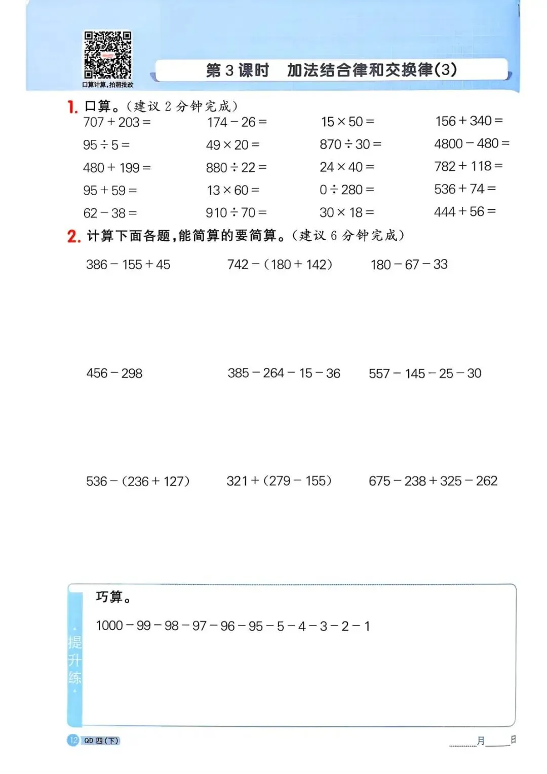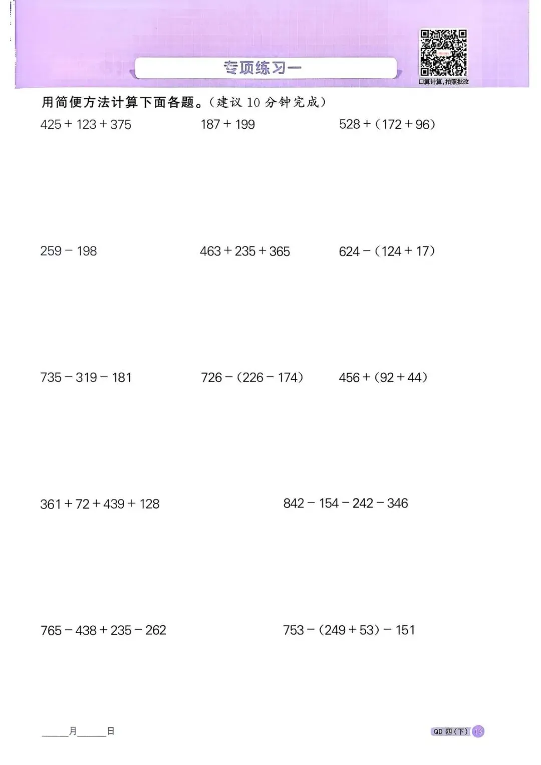 26春青岛版63数学四年级下册《口算+简便计算天天练》附答案| 高清可打印.口算竖式提升练习