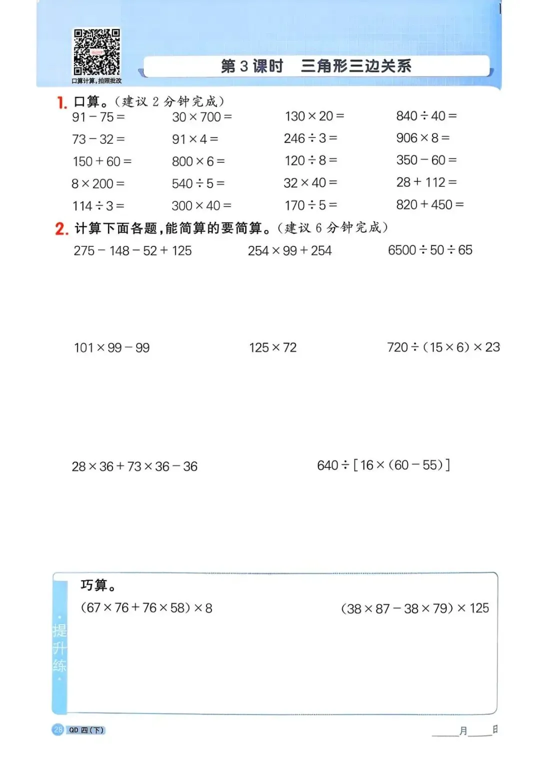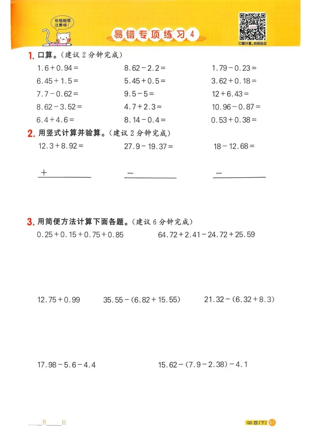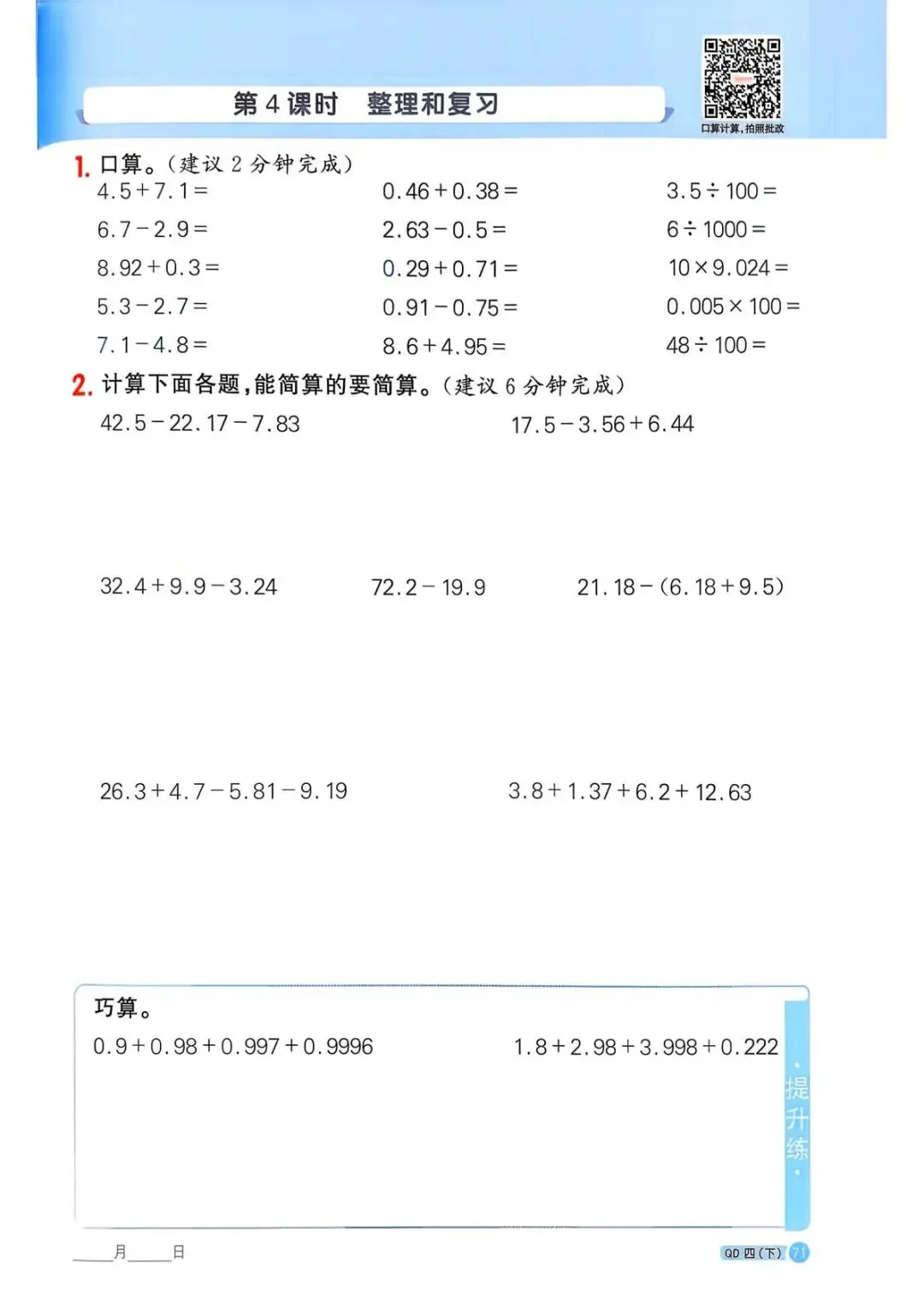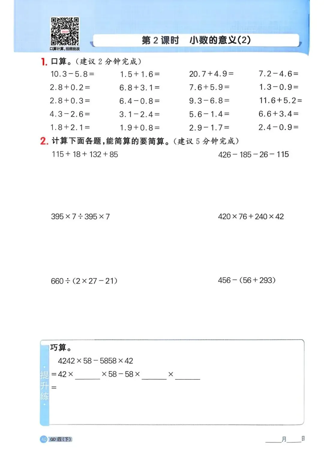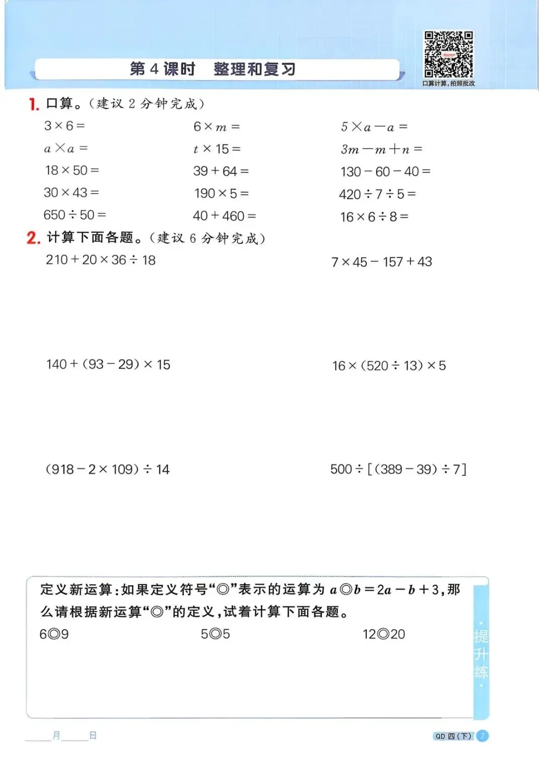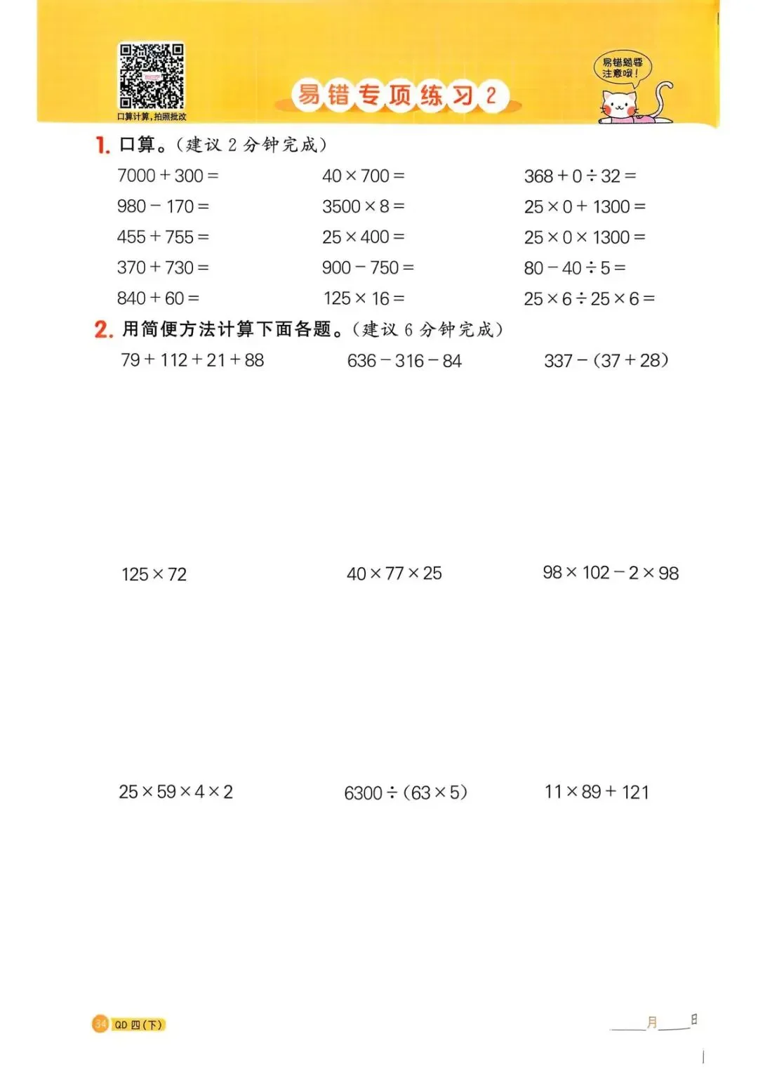 26春青岛版63数学四年级下册《口算+简便计算天天练》附答案| 高清可打印.口算竖式提升练习