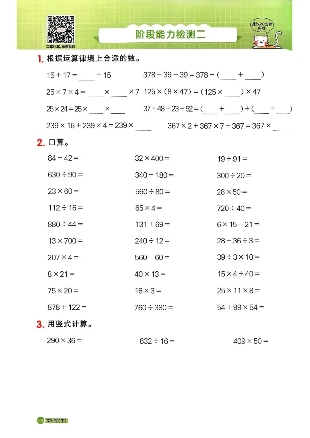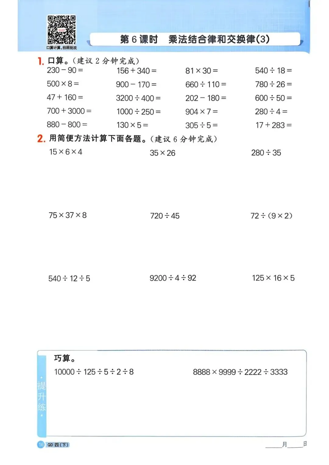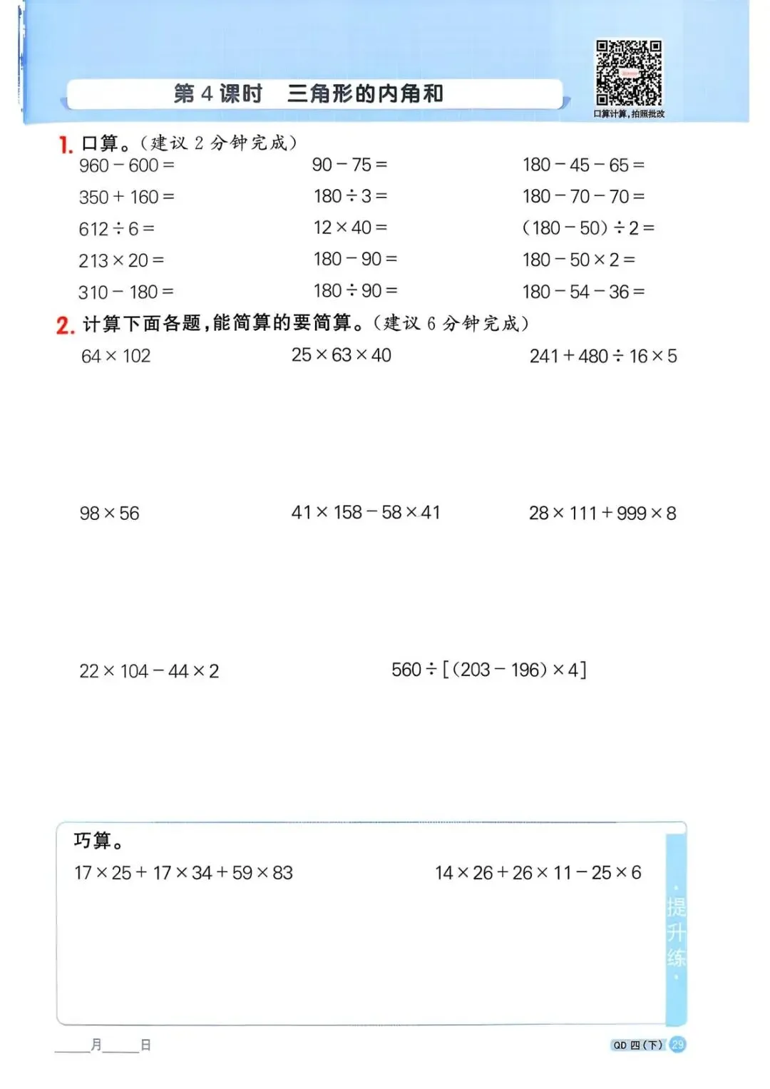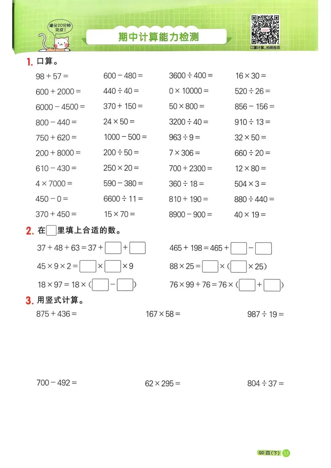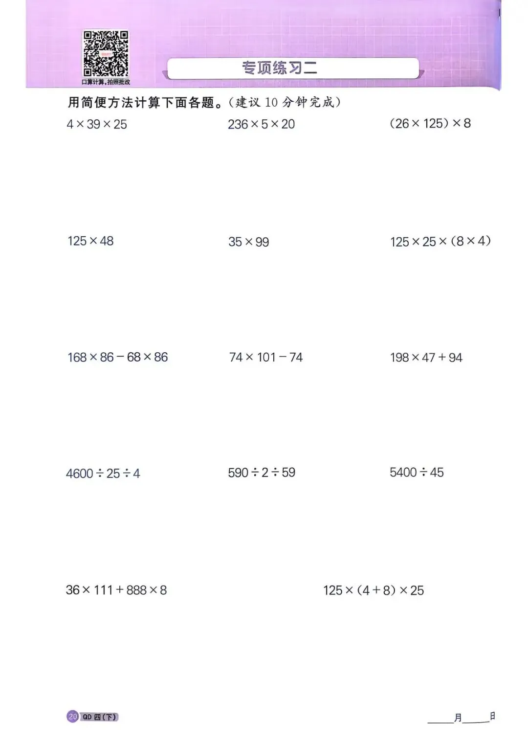 26春青岛版63数学四年级下册《口算+简便计算天天练》附答案| 高清可打印.口算竖式提升练习