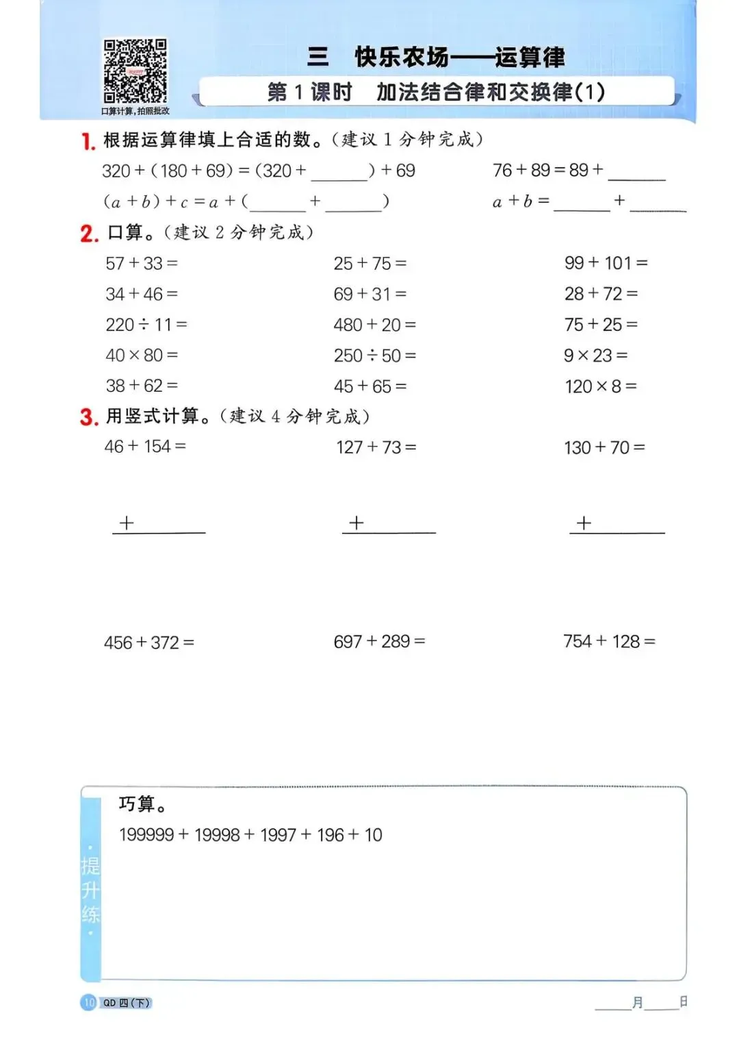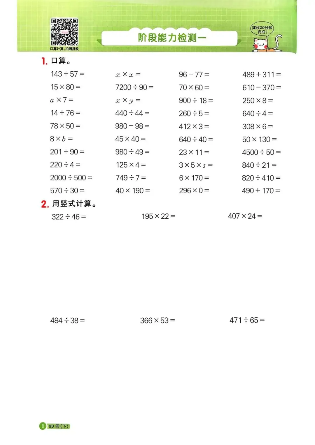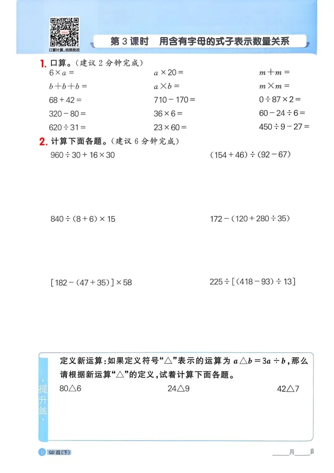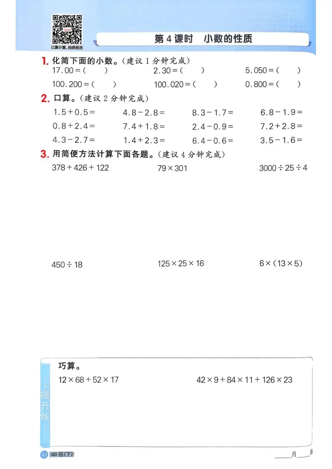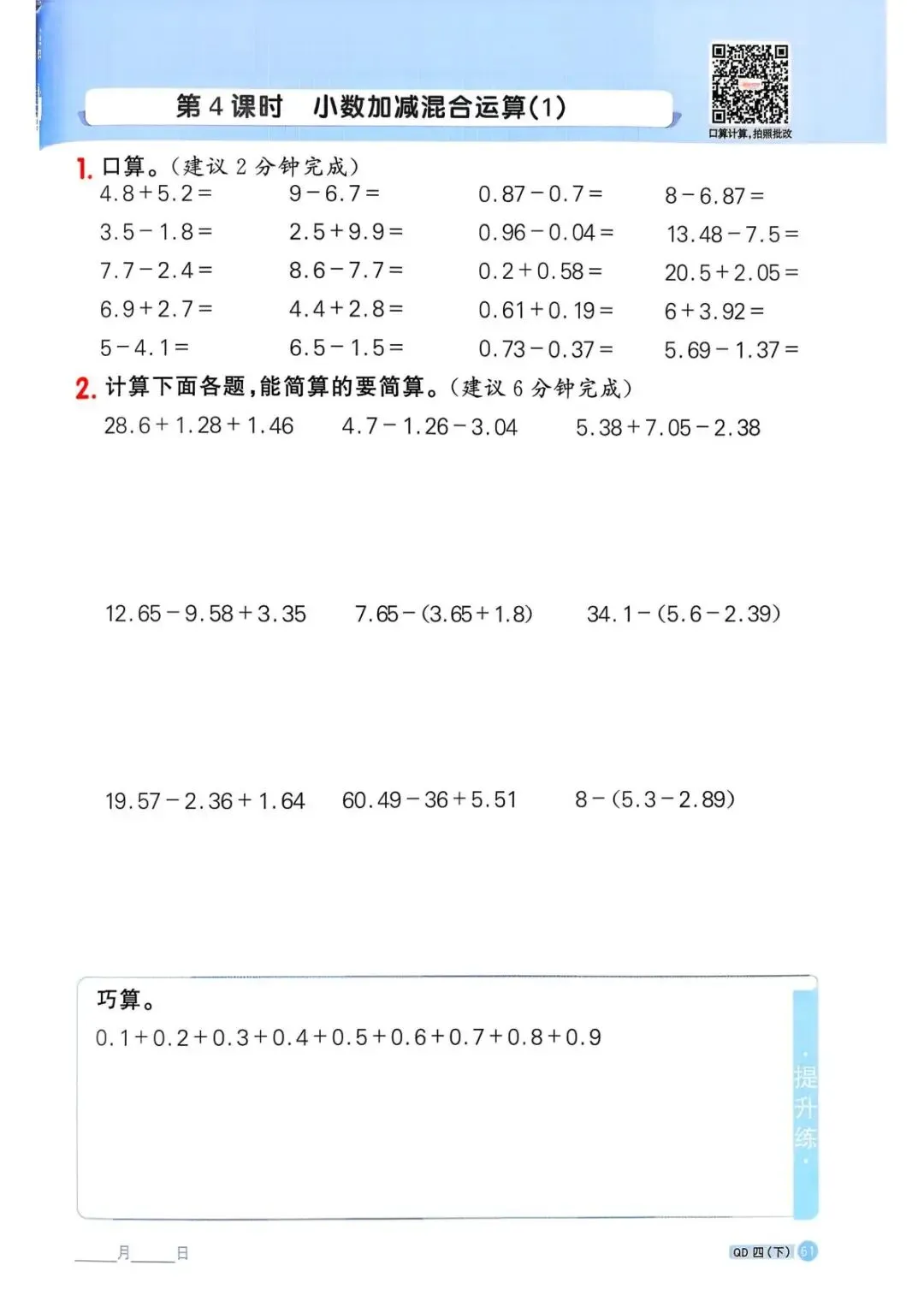 26春青岛版63数学四年级下册《口算+简便计算天天练》附答案| 高清可打印.口算竖式提升练习