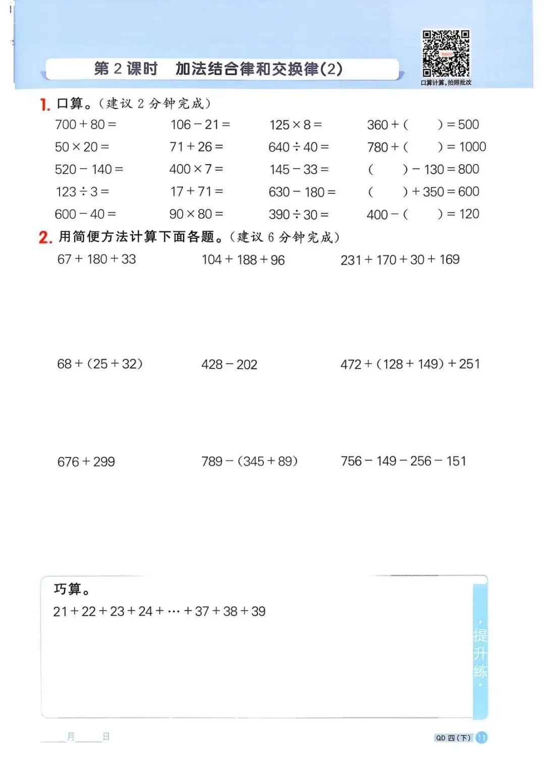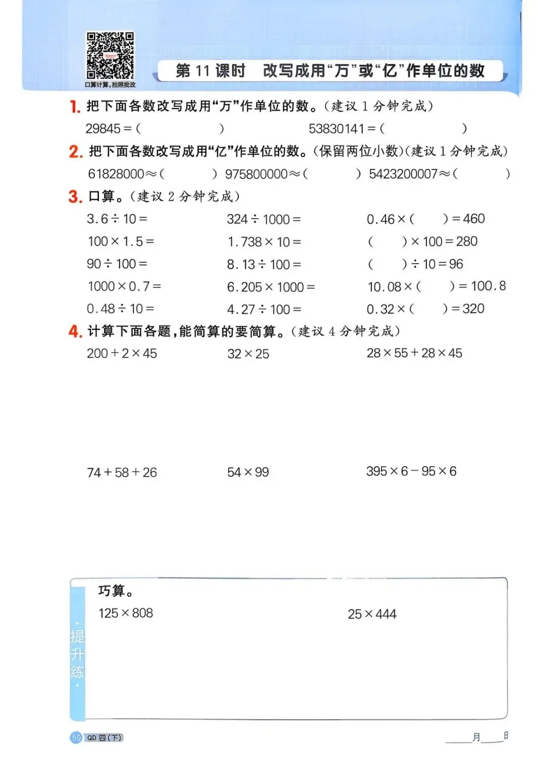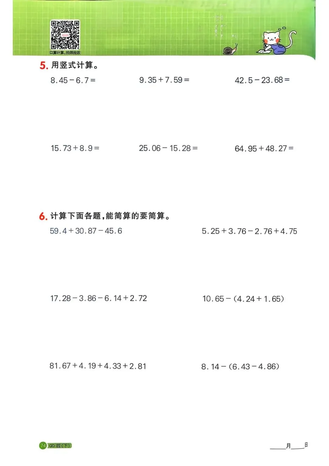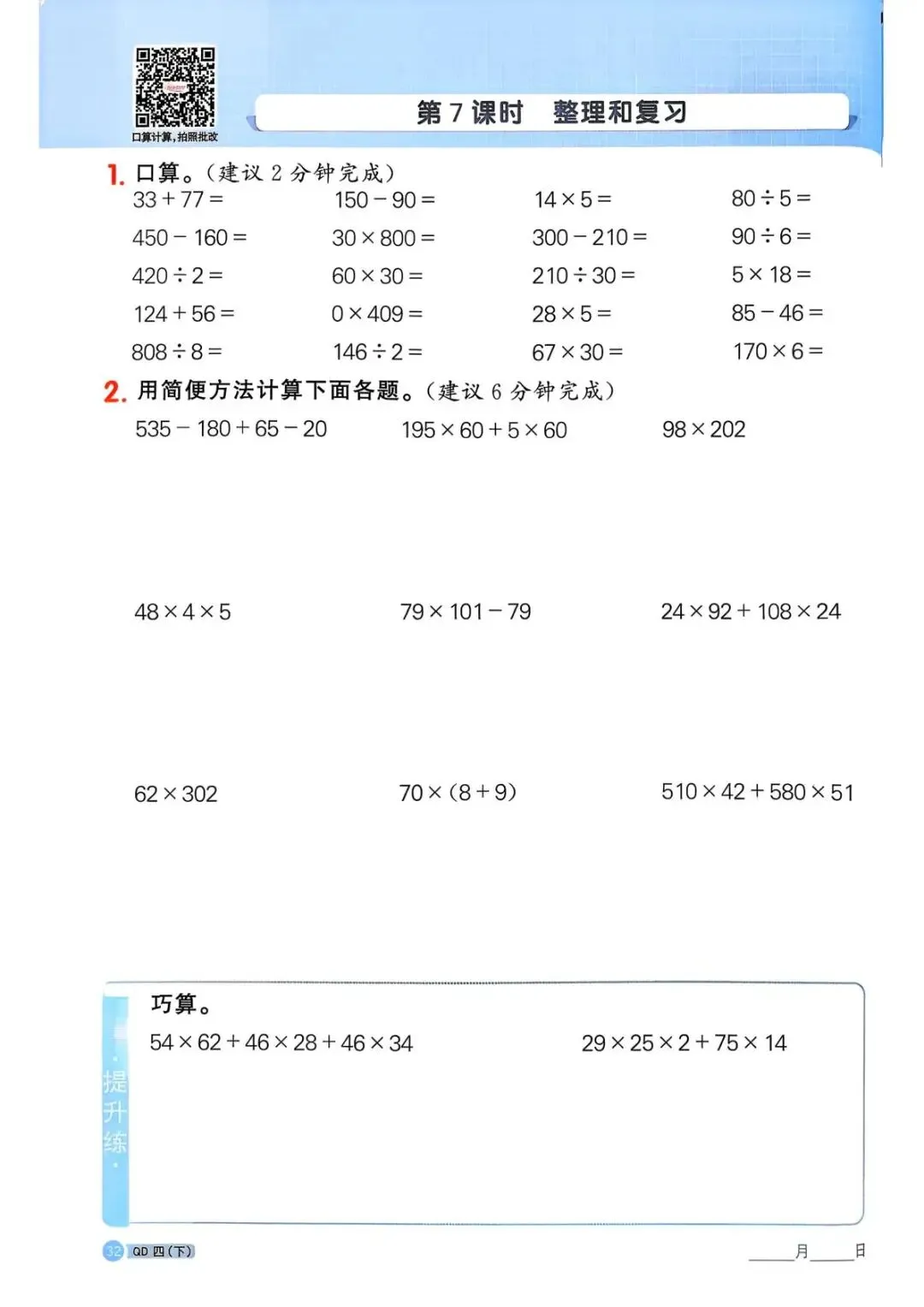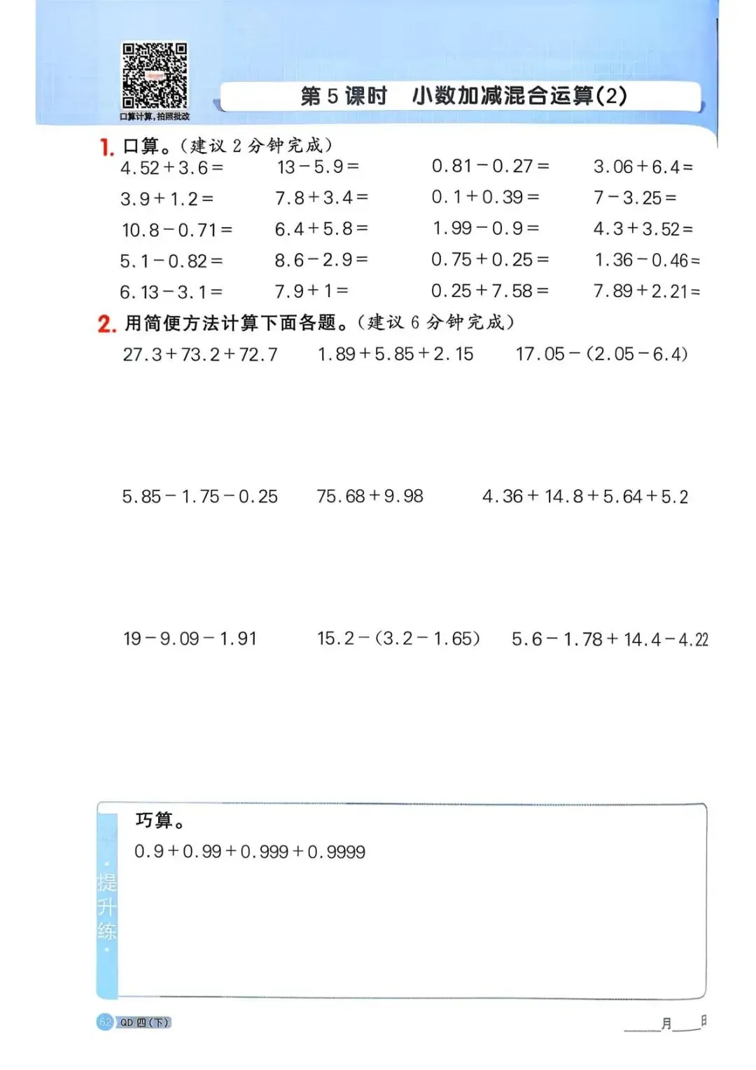 26春青岛版63数学四年级下册《口算+简便计算天天练》附答案| 高清可打印.口算竖式提升练习