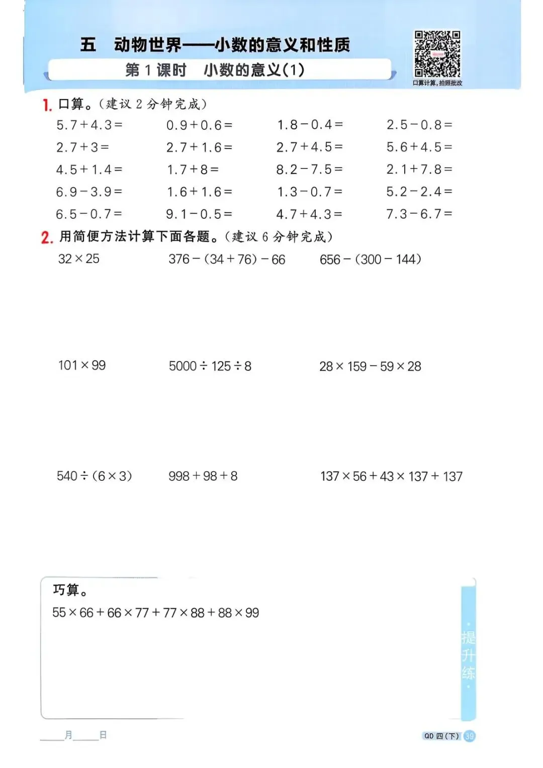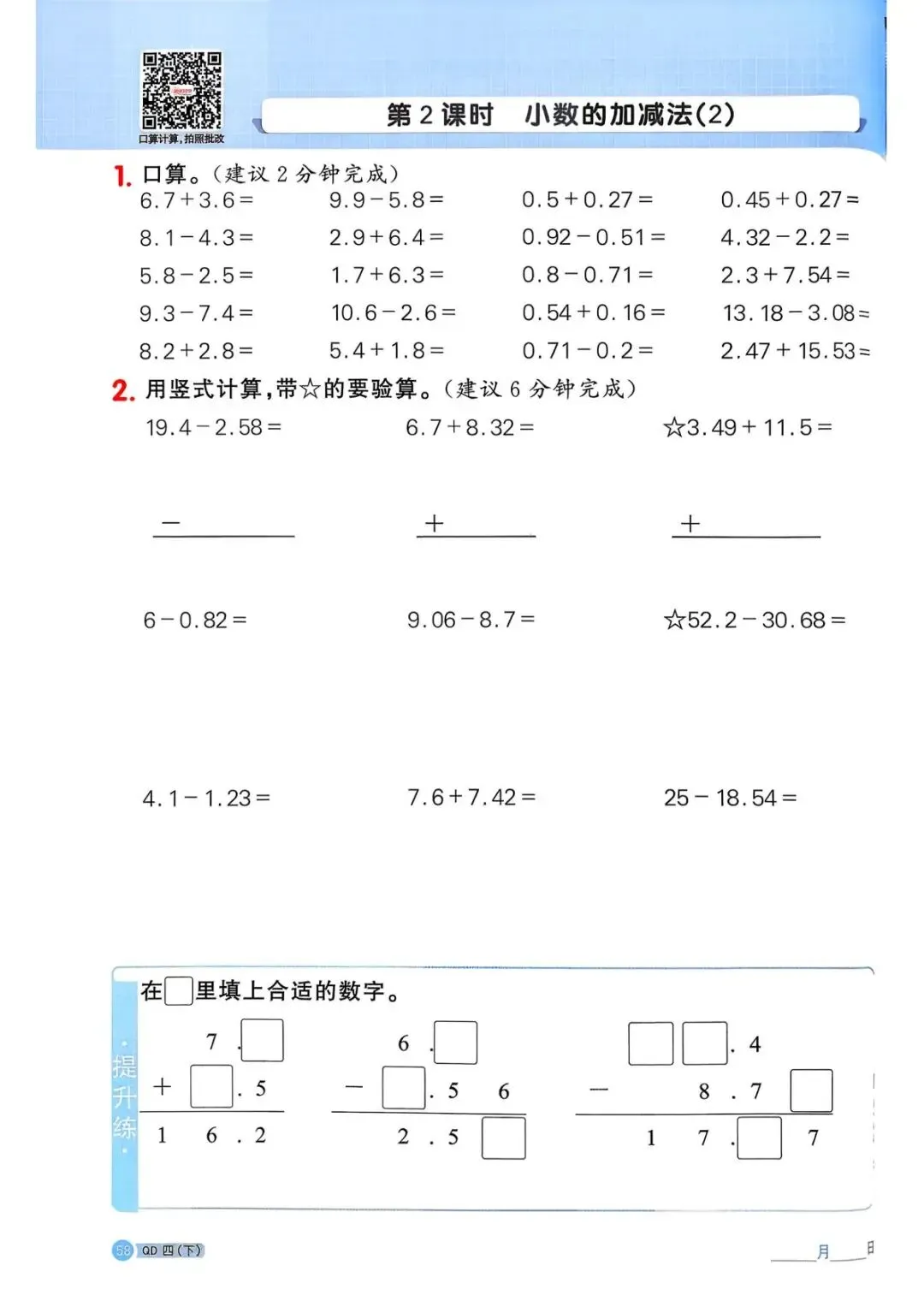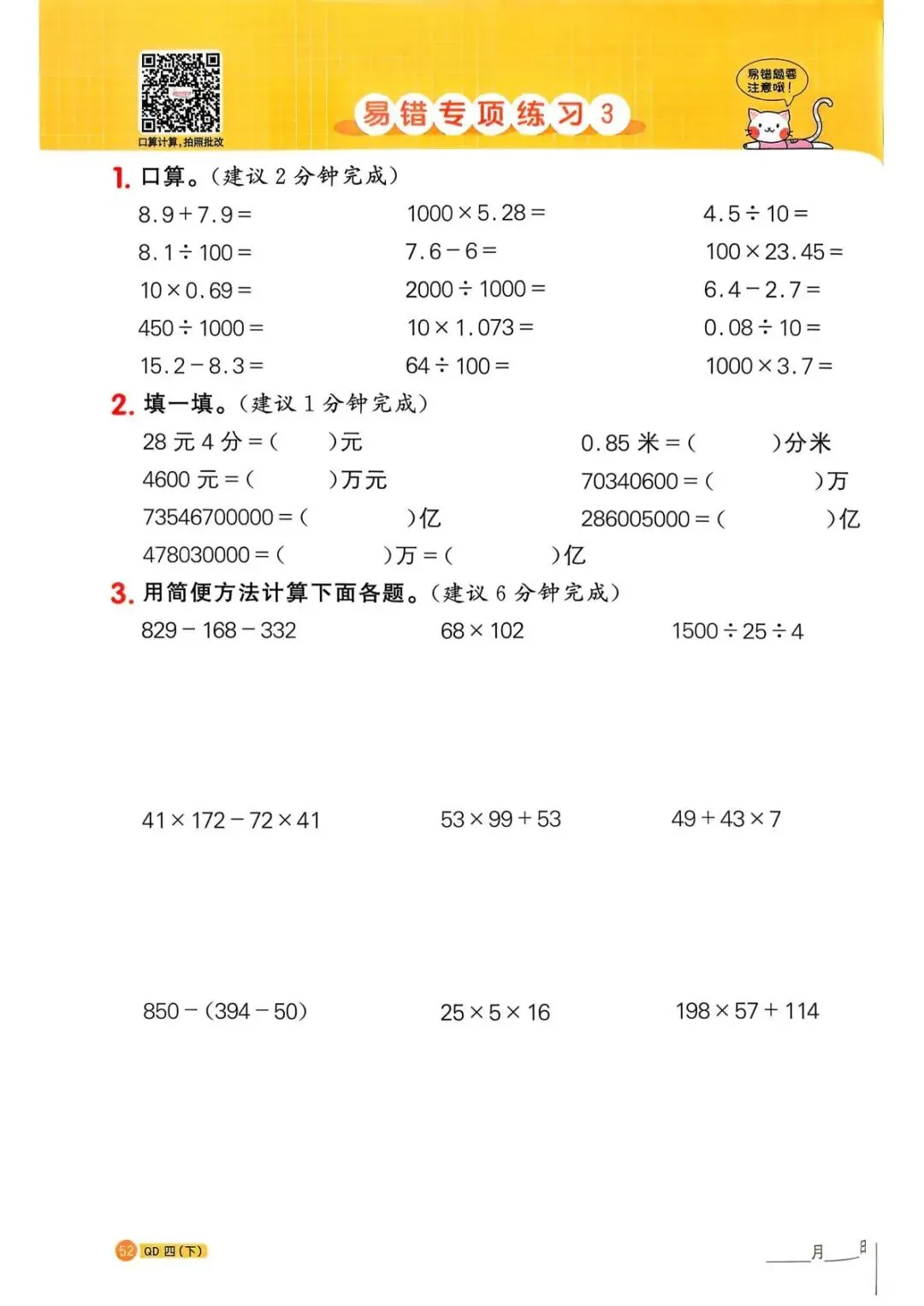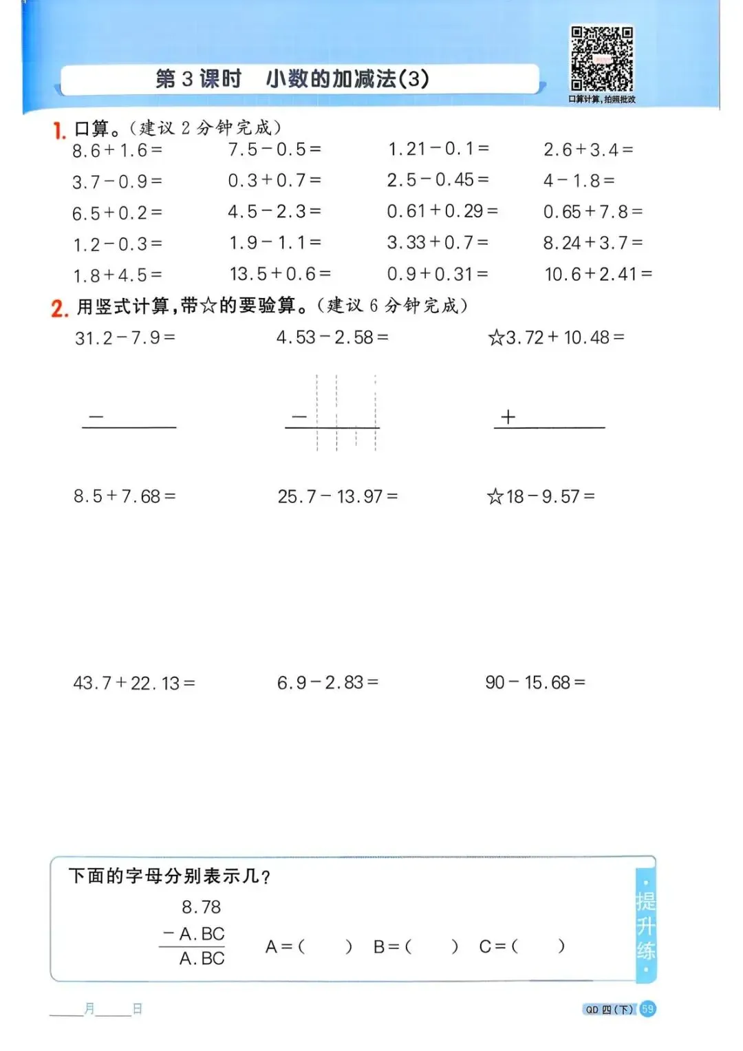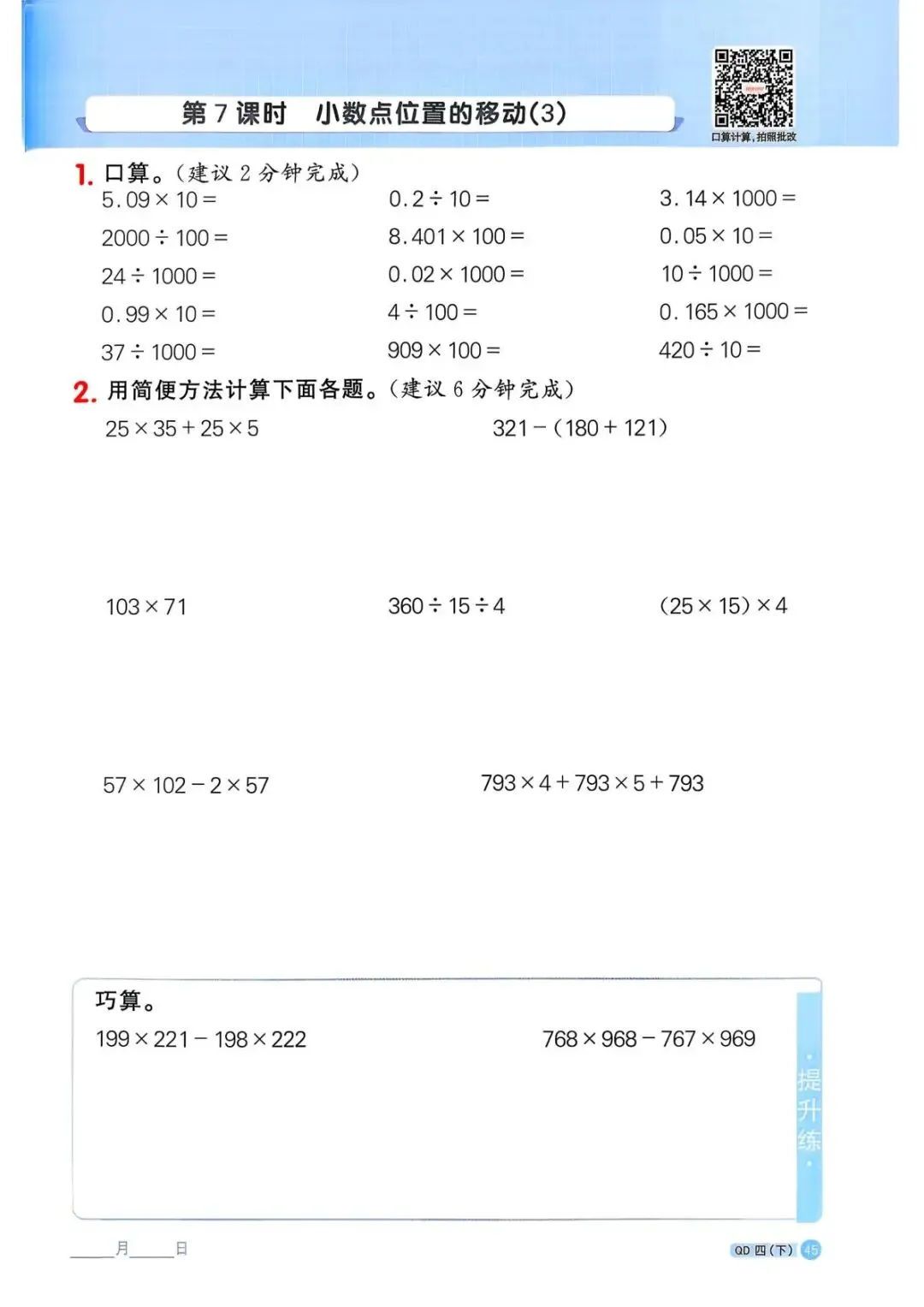 26春青岛版63数学四年级下册《口算+简便计算天天练》附答案| 高清可打印.口算竖式提升练习