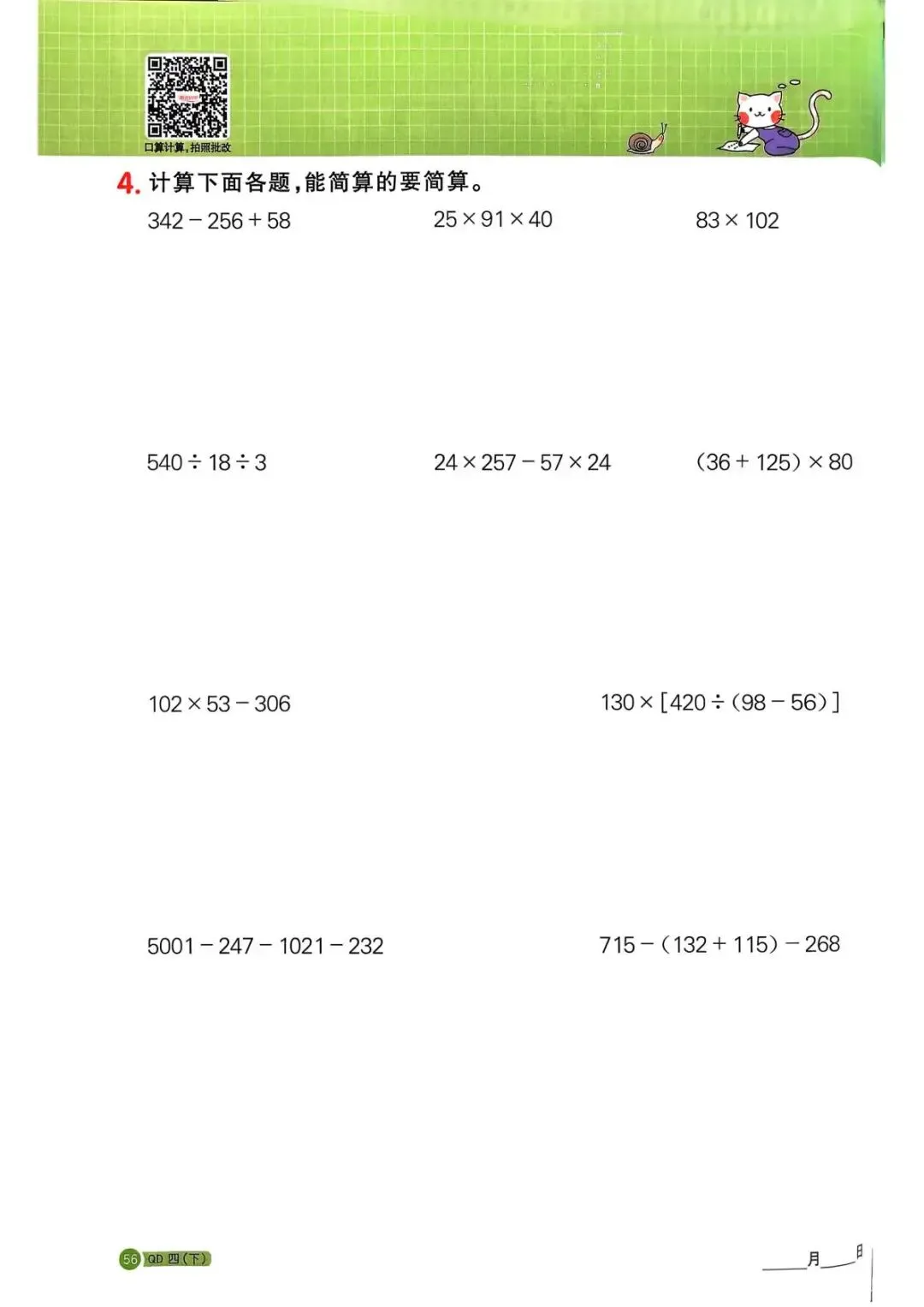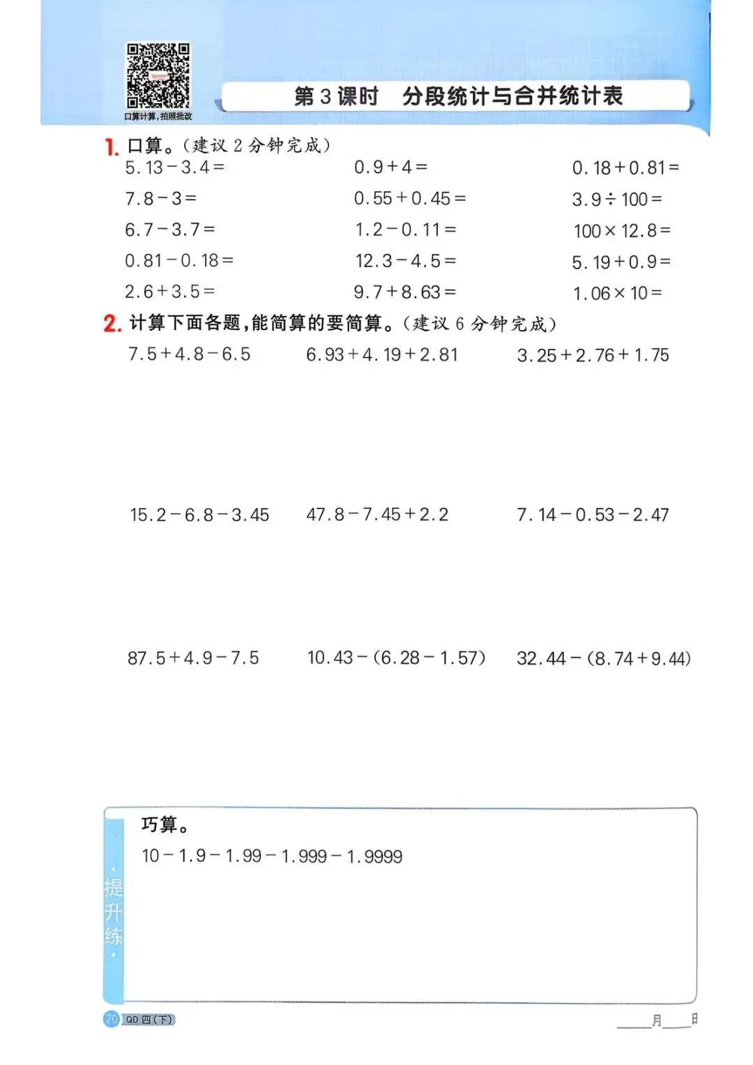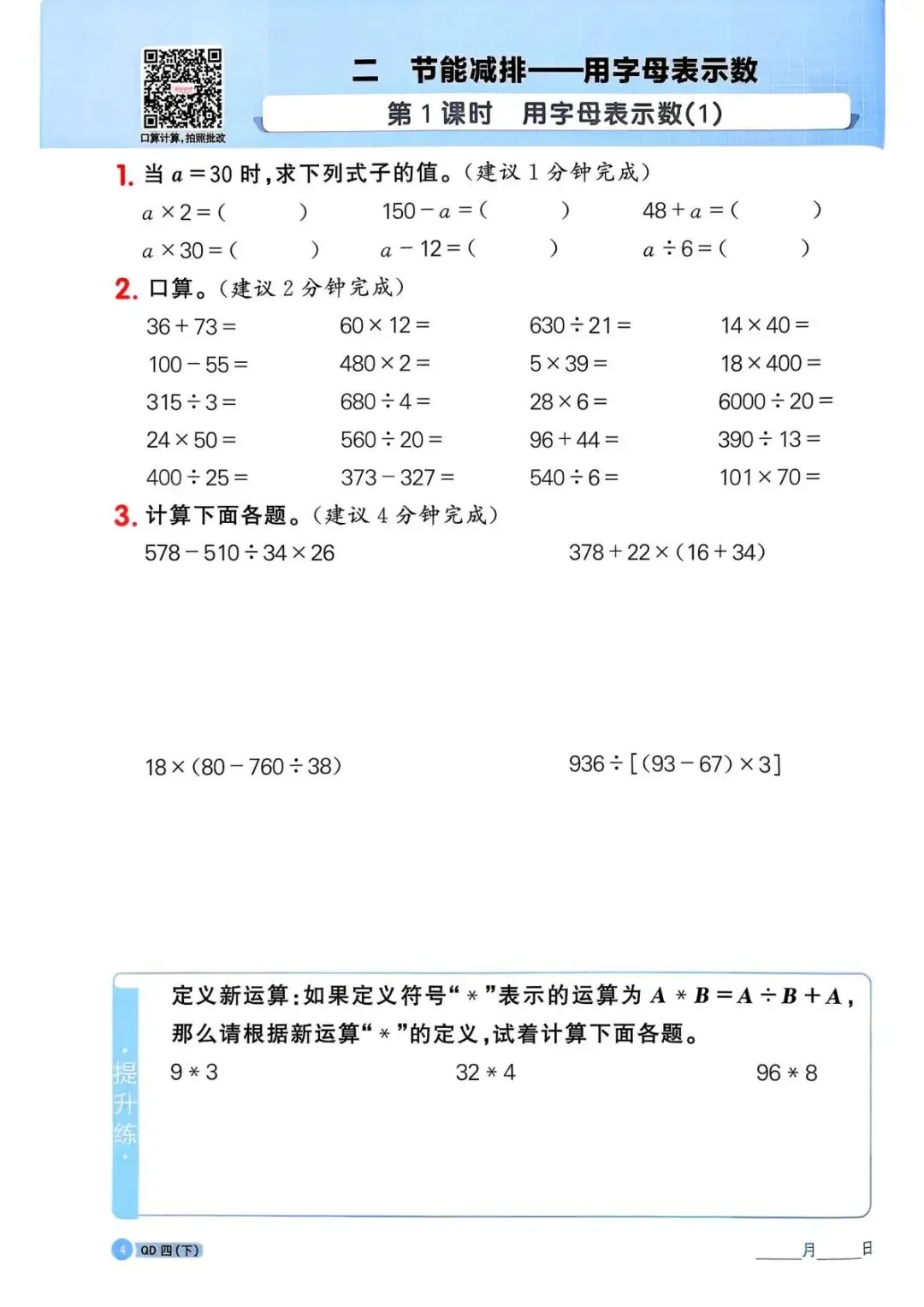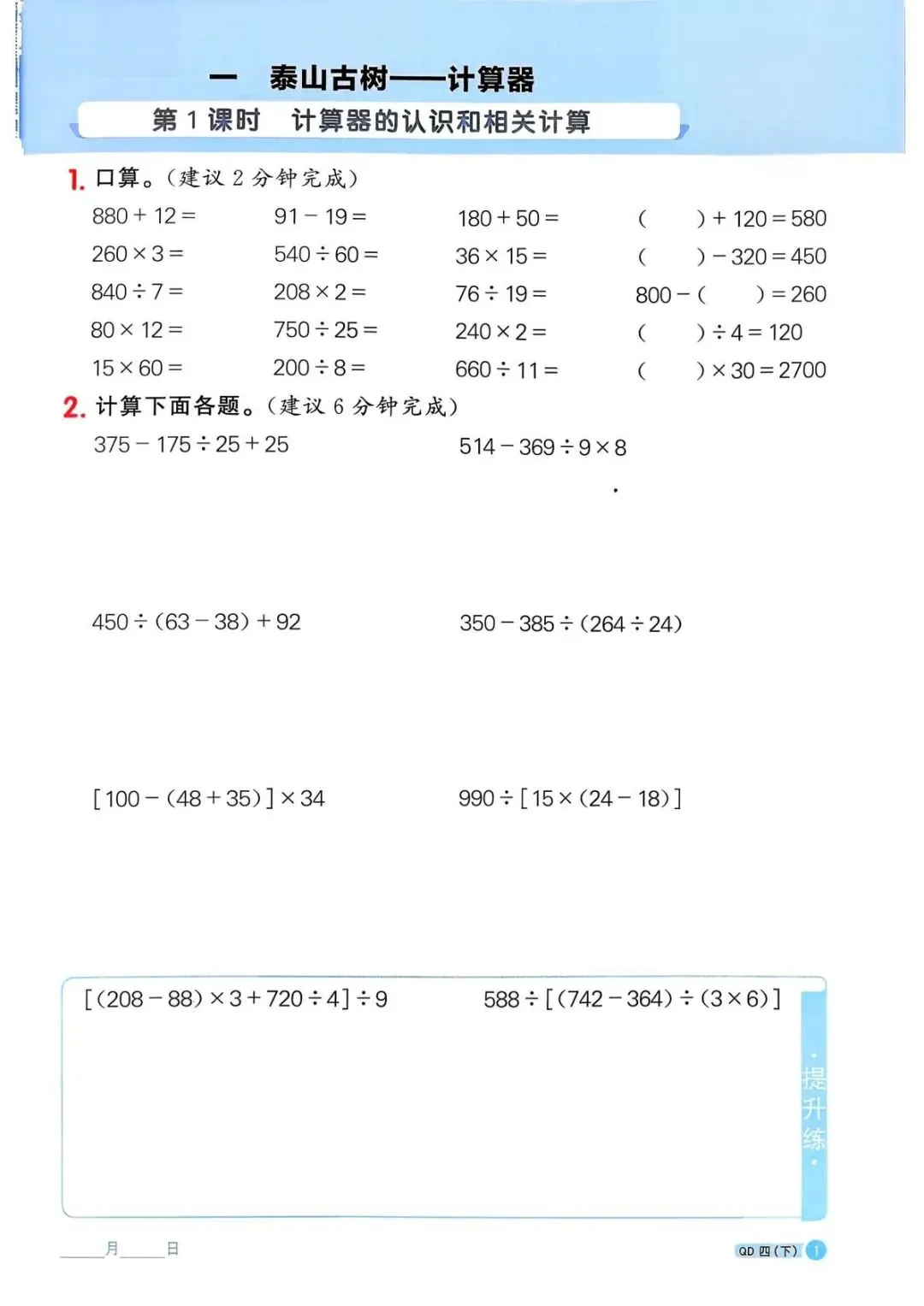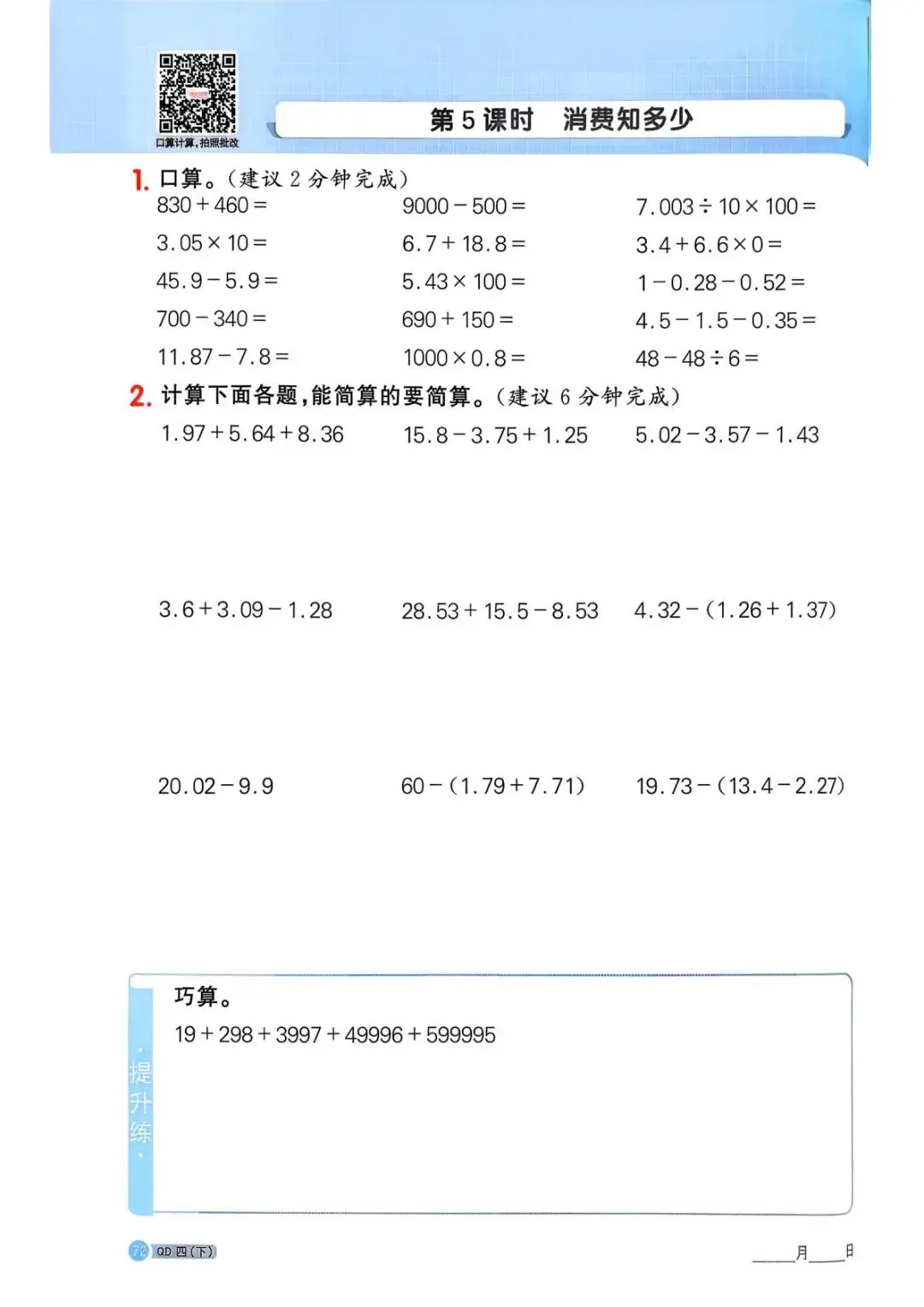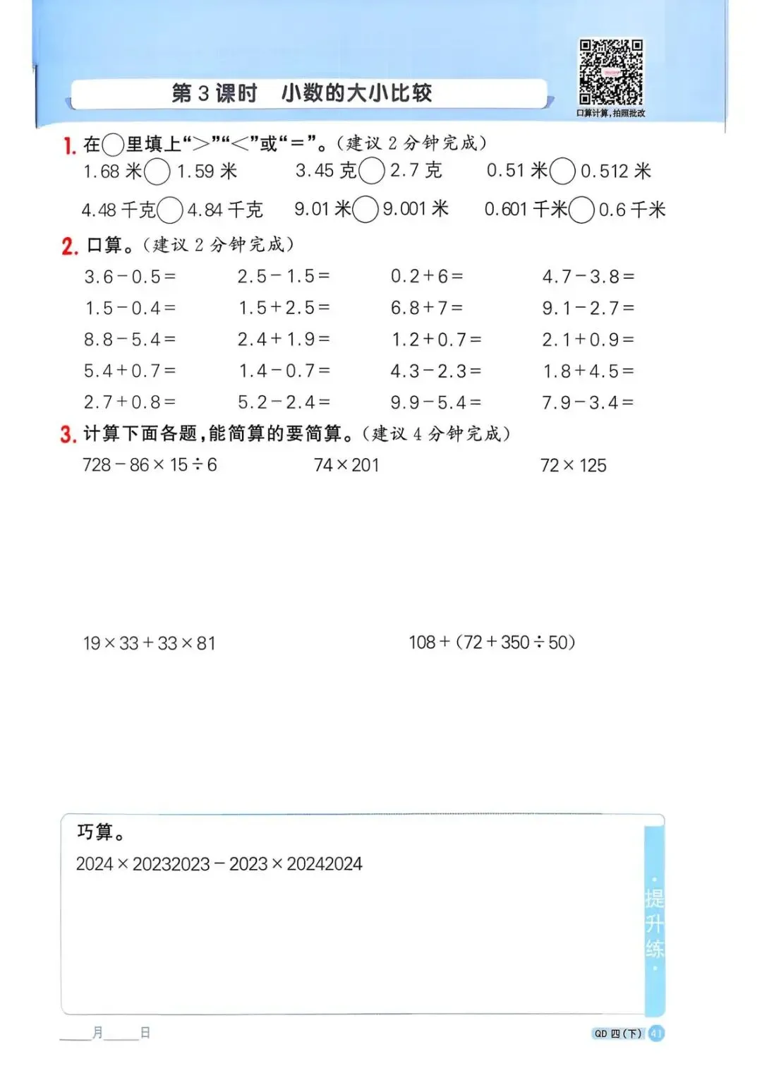26春青岛版63数学四年级下册《口算+简便计算天天练》附答案| 高清可打印.口算竖式提升练习