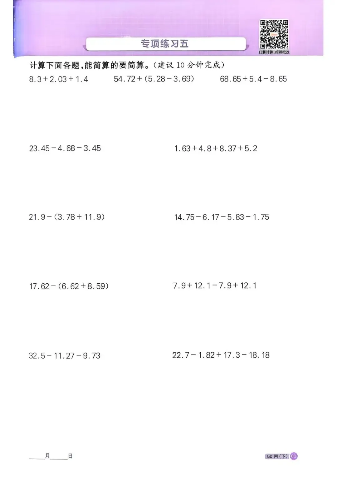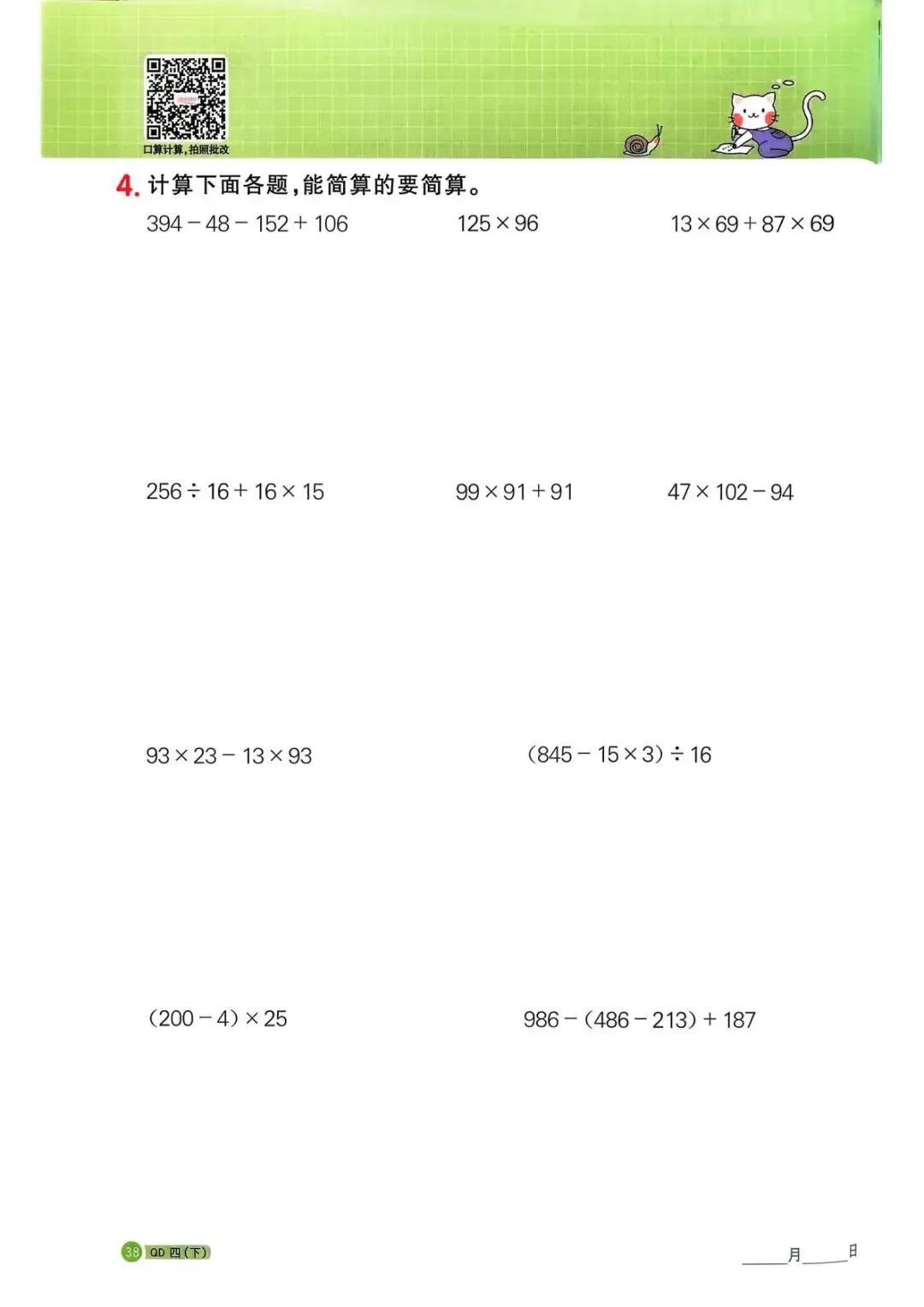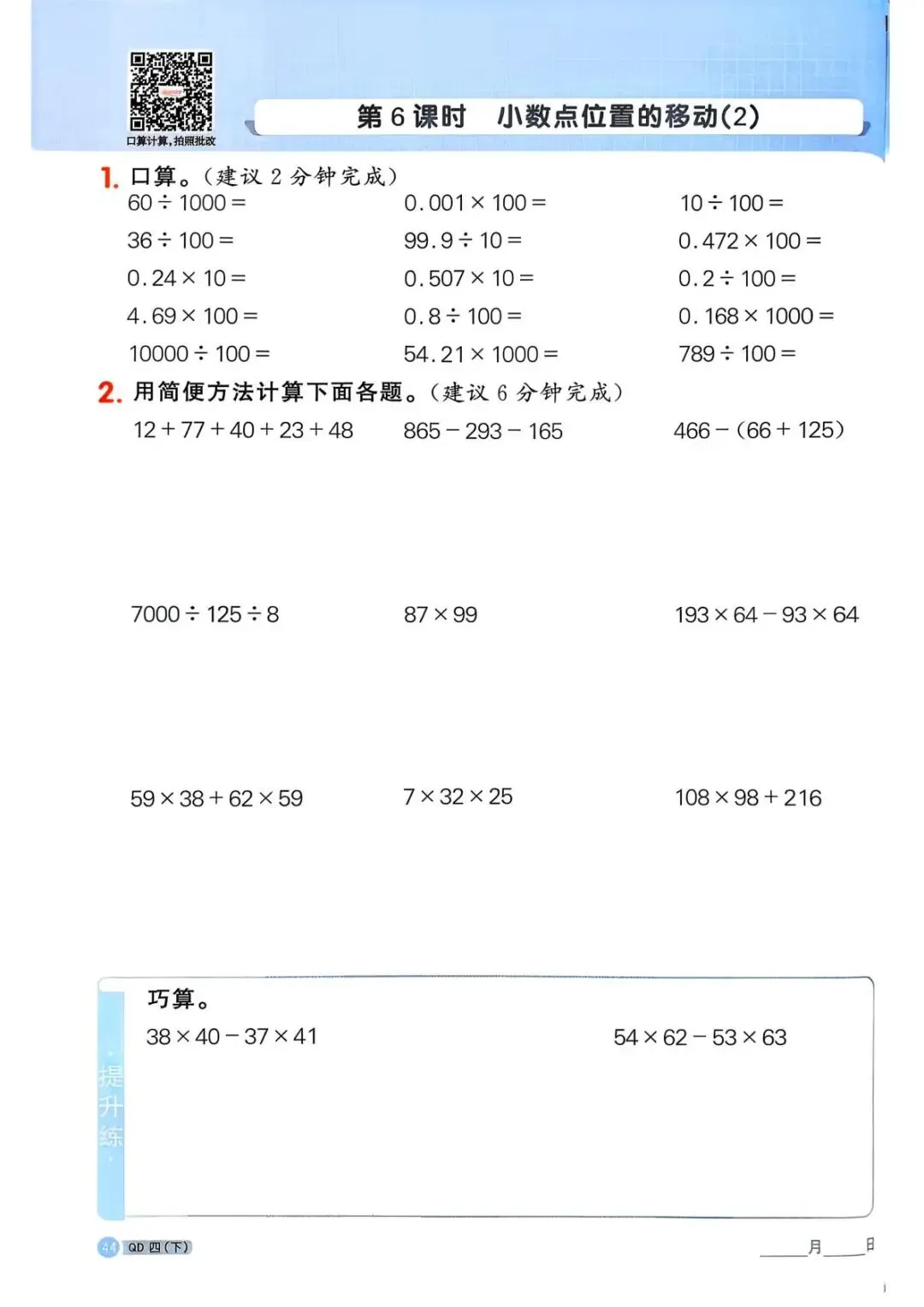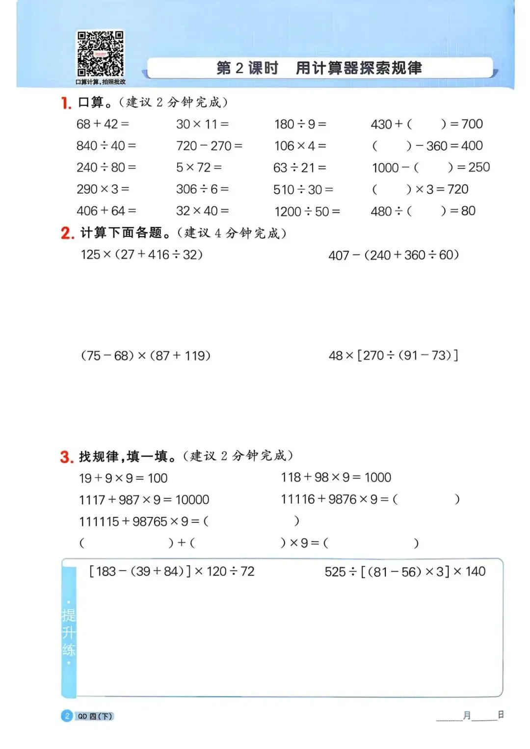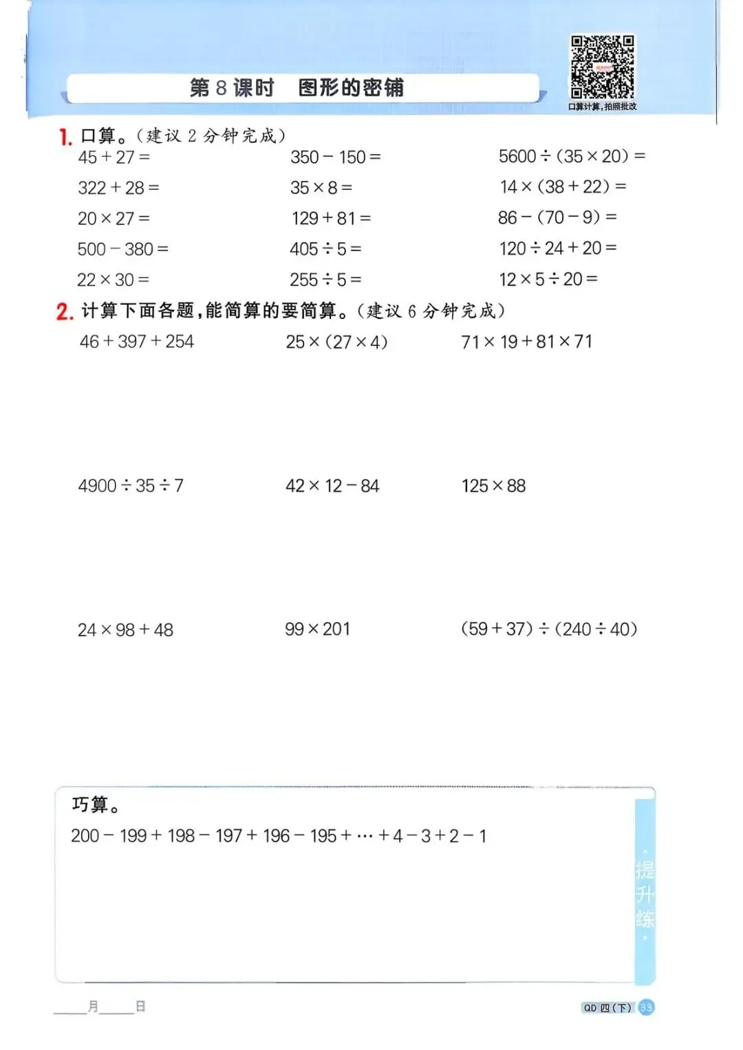 26春青岛版63数学四年级下册《口算+简便计算天天练》附答案| 高清可打印.口算竖式提升练习