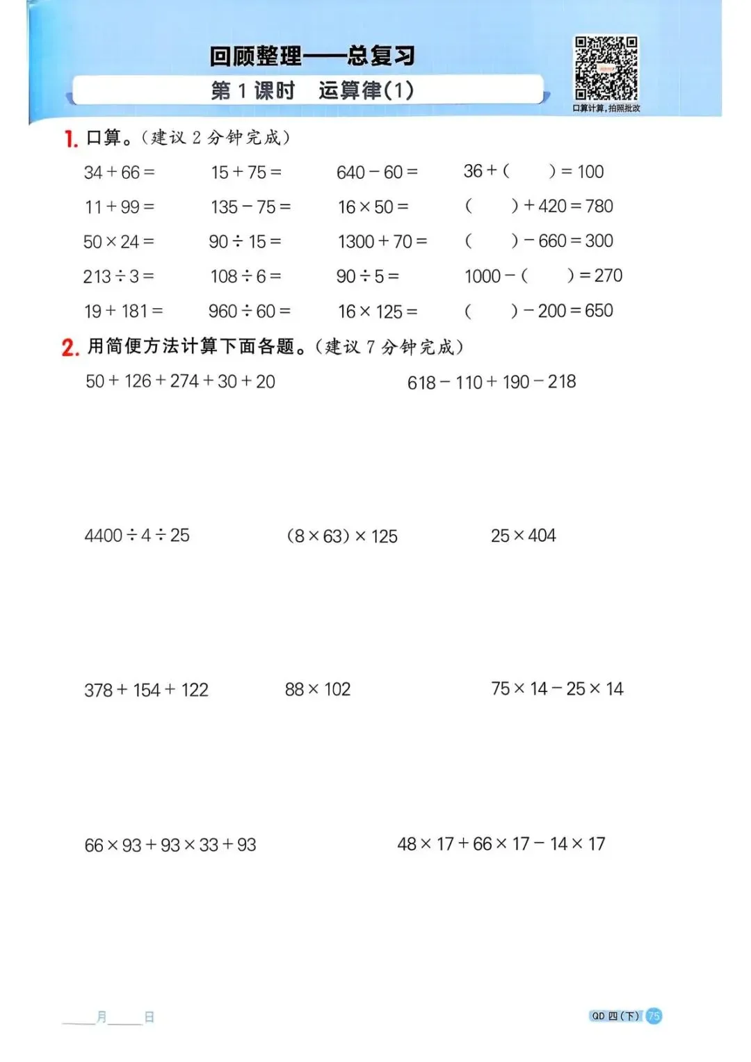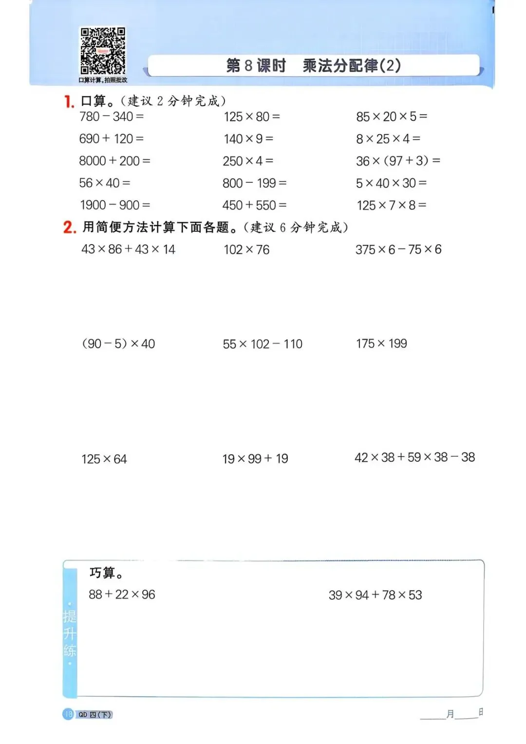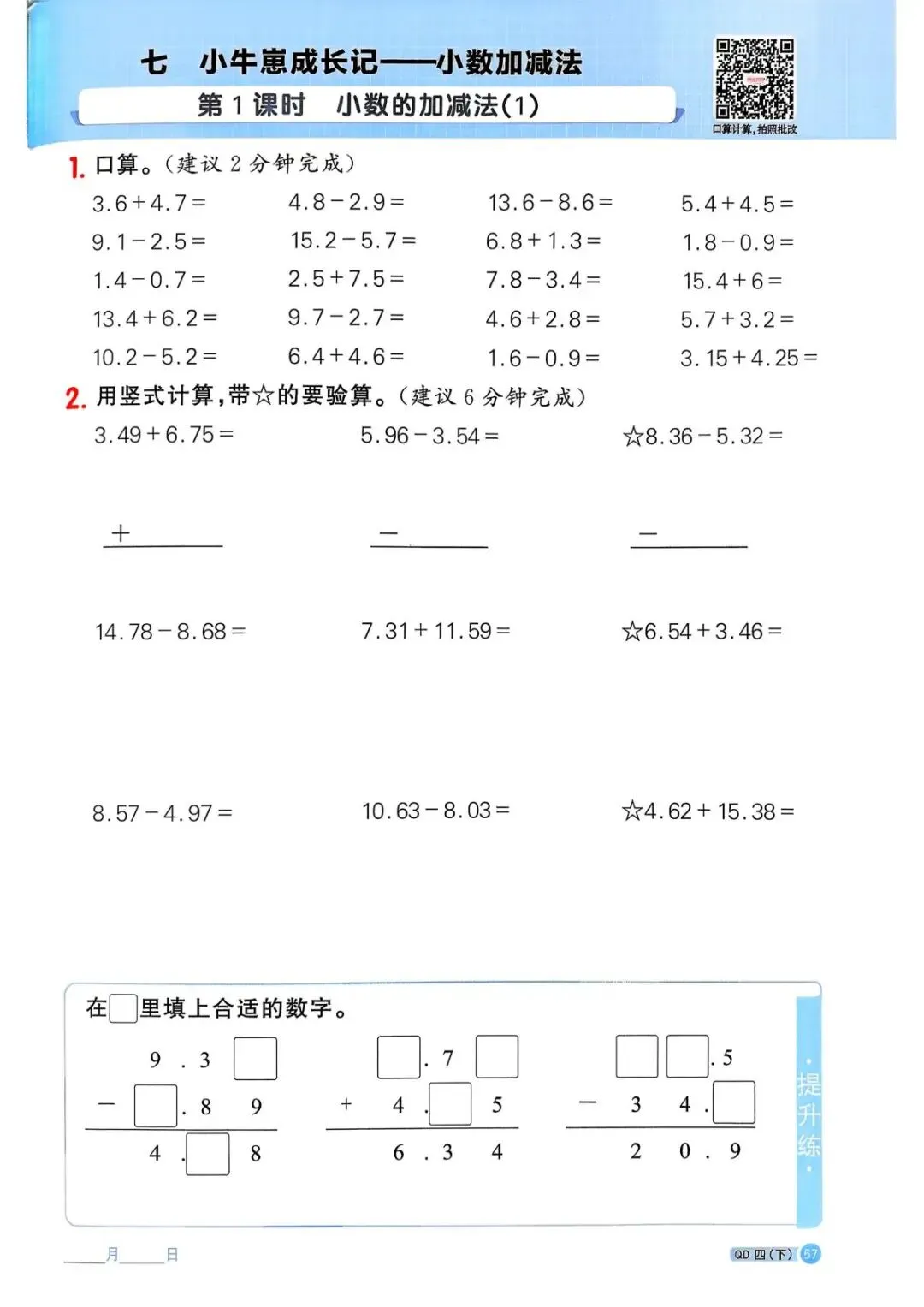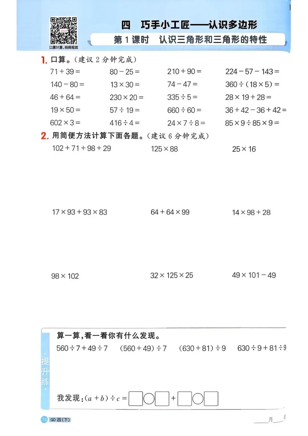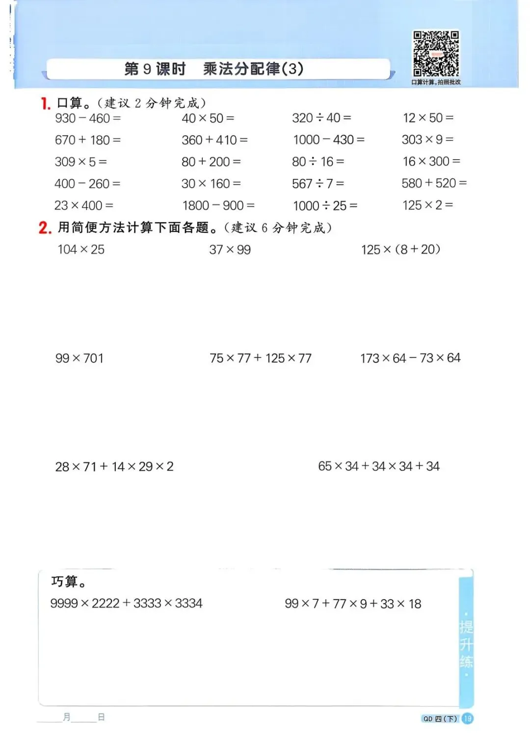 26春青岛版63数学四年级下册《口算+简便计算天天练》附答案| 高清可打印.口算竖式提升练习