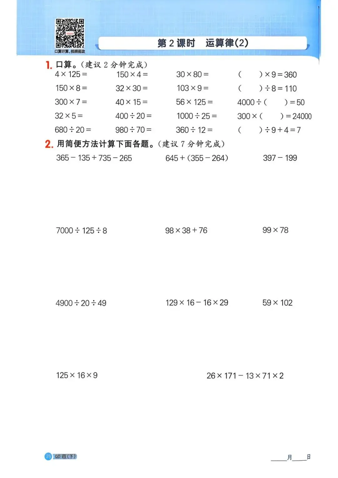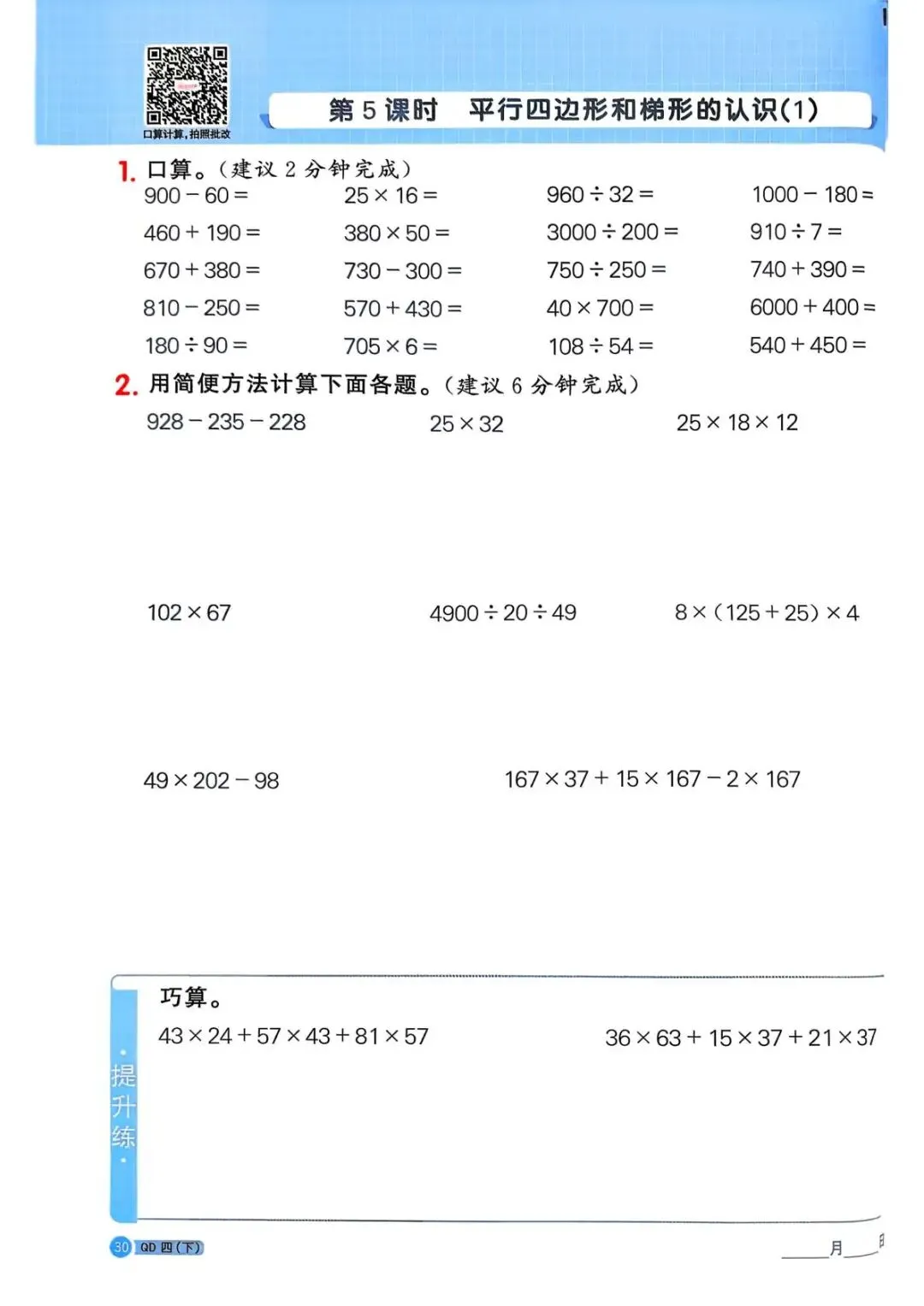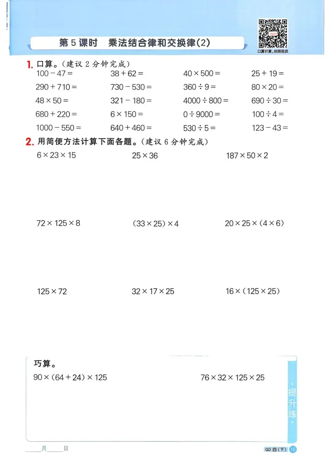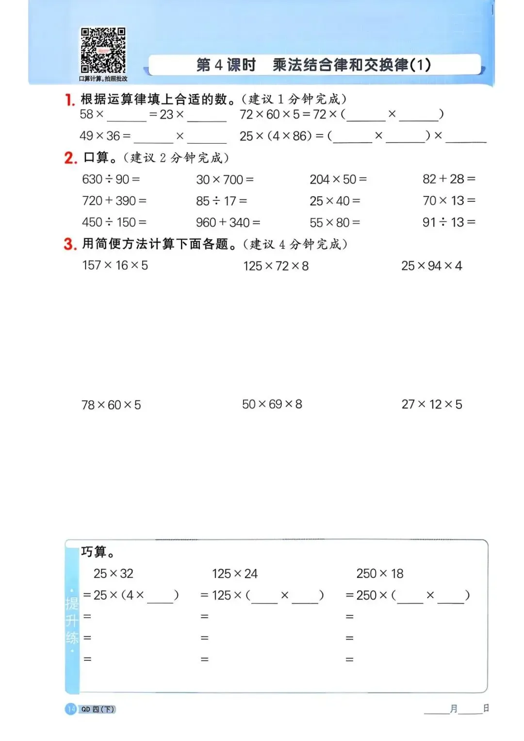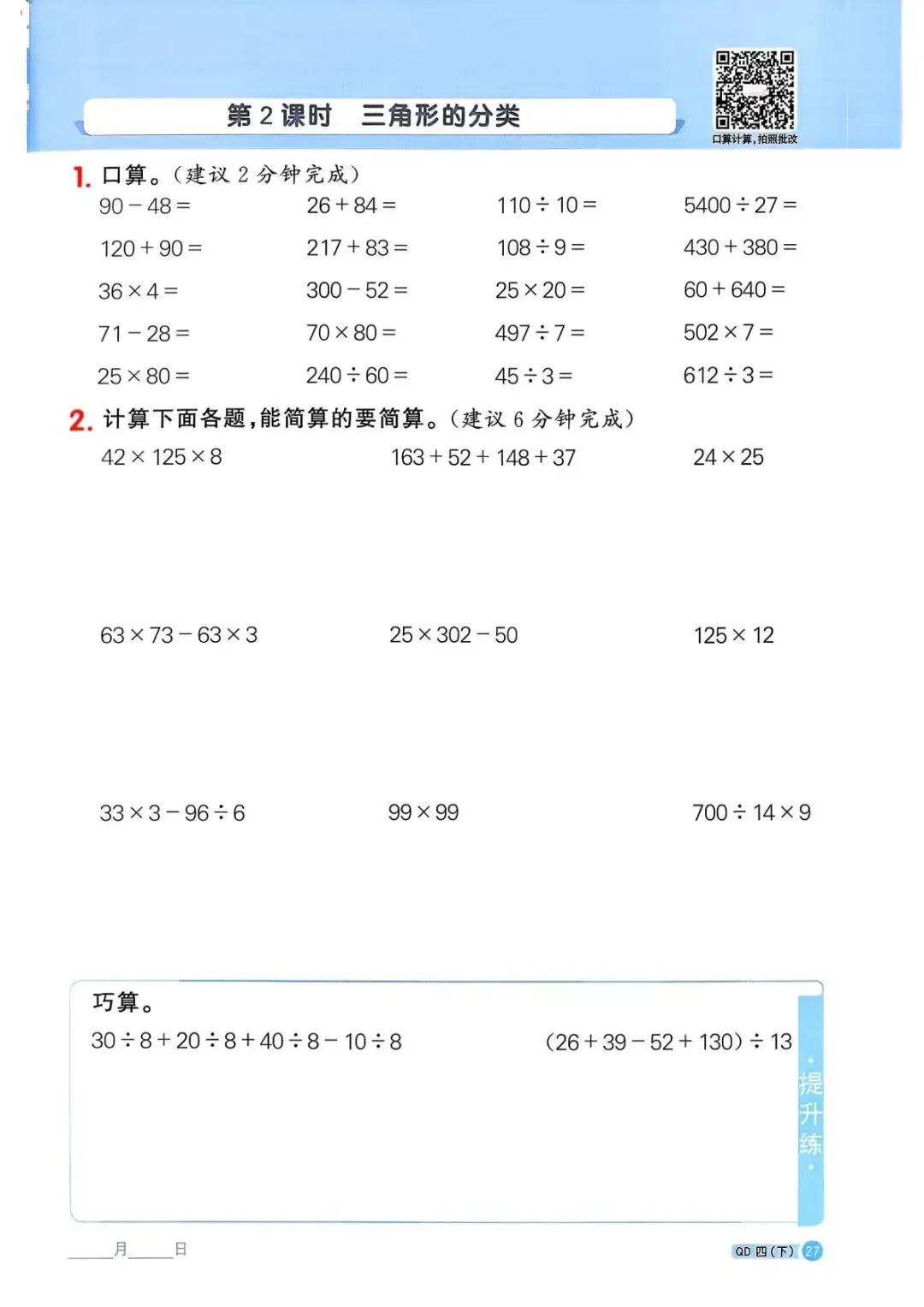 26春青岛版63数学四年级下册《口算+简便计算天天练》附答案| 高清可打印.口算竖式提升练习