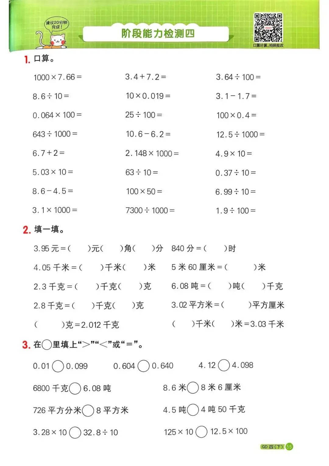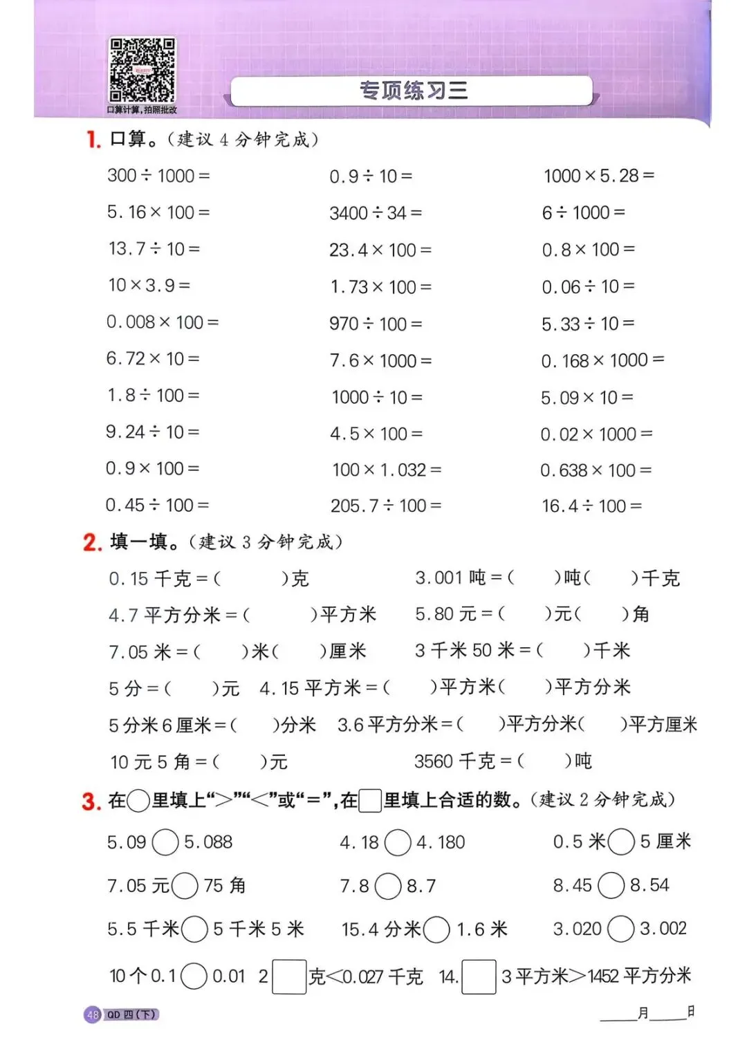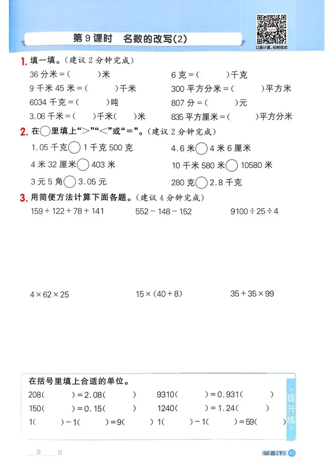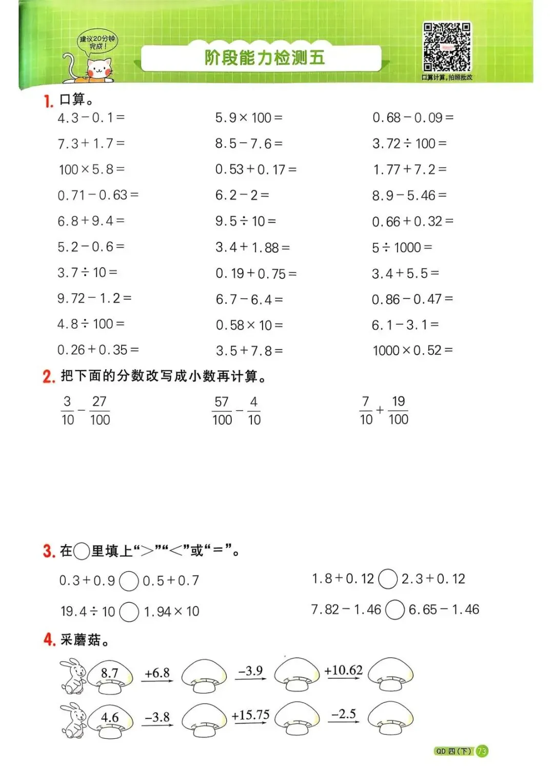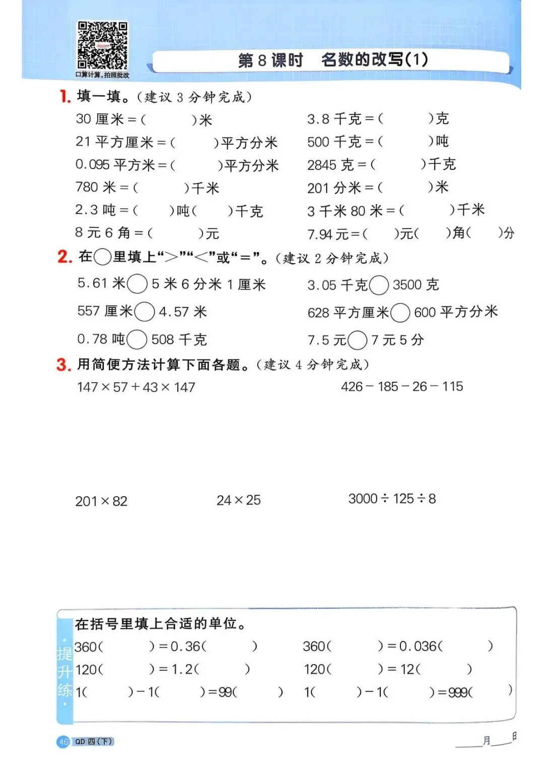 26春青岛版63数学四年级下册《口算+简便计算天天练》附答案| 高清可打印.口算竖式提升练习