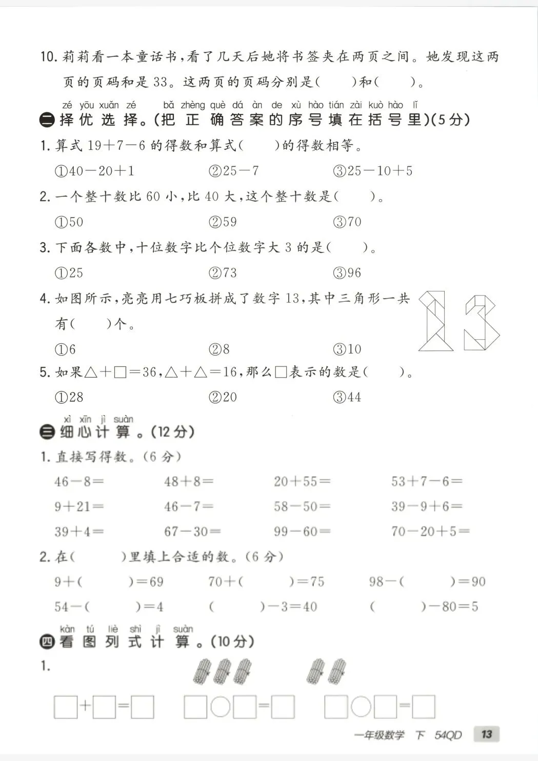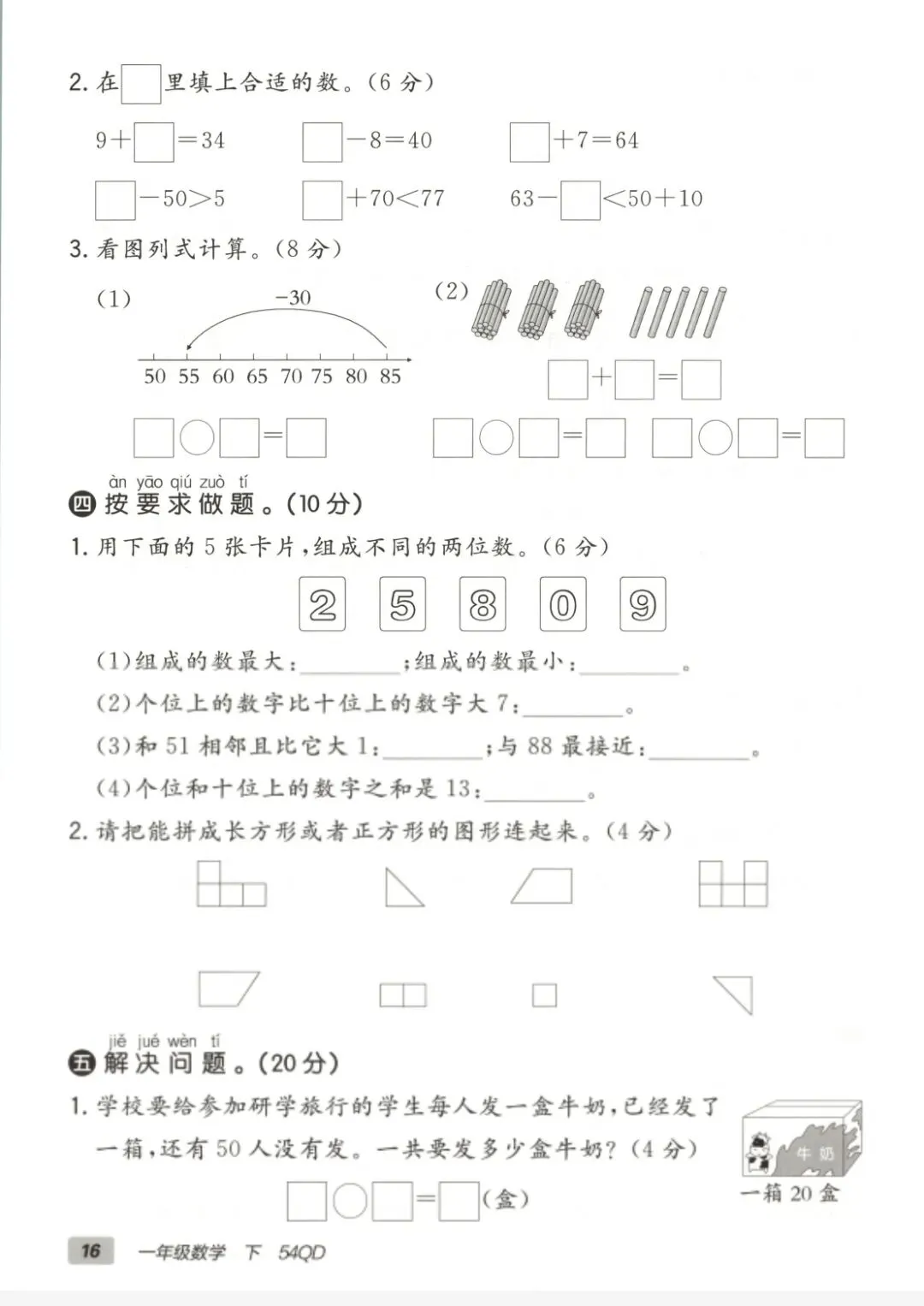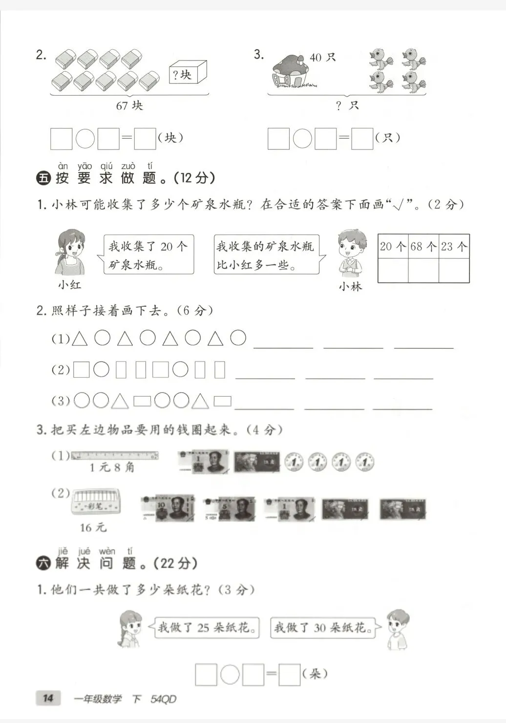 青岛五四版一年级下册数学《期中测试卷》2套 有答案 电子版🉑下载,家长可以下载下来给学生巩固练习