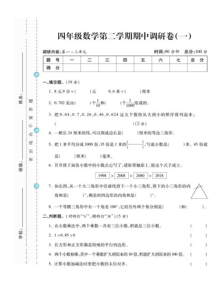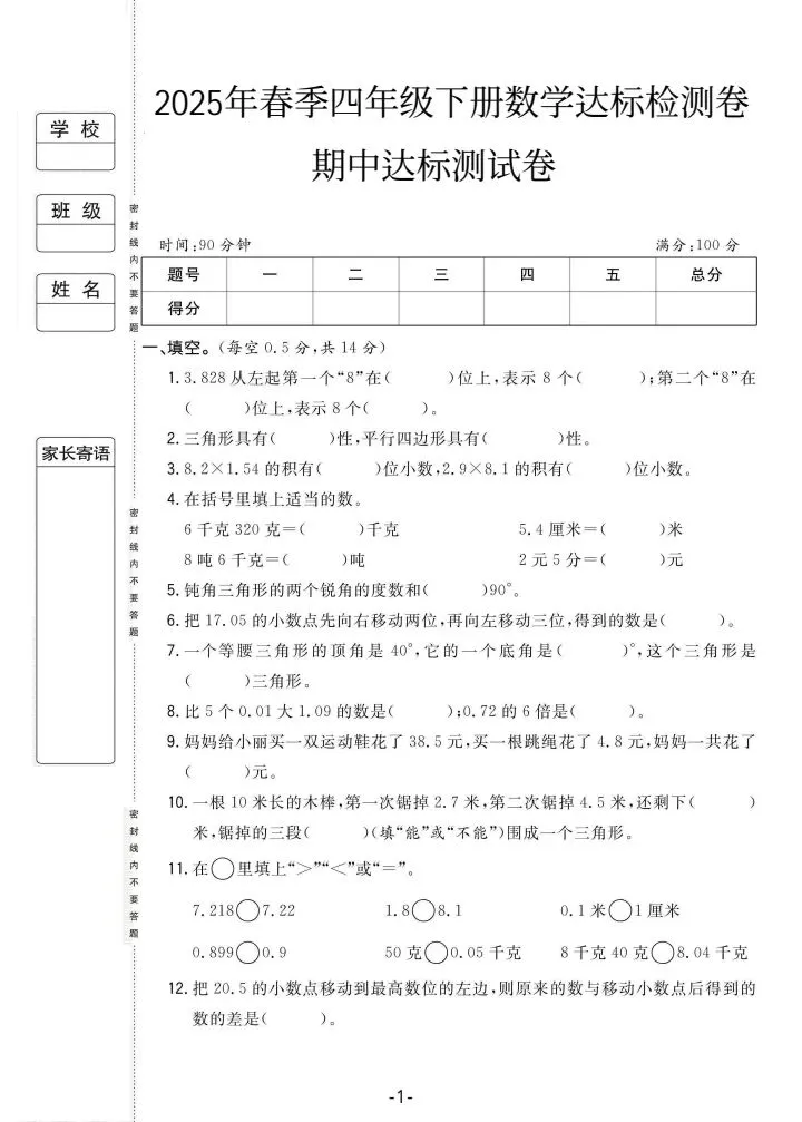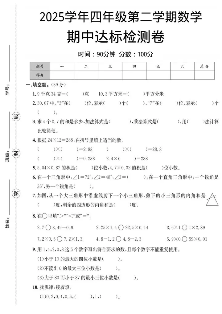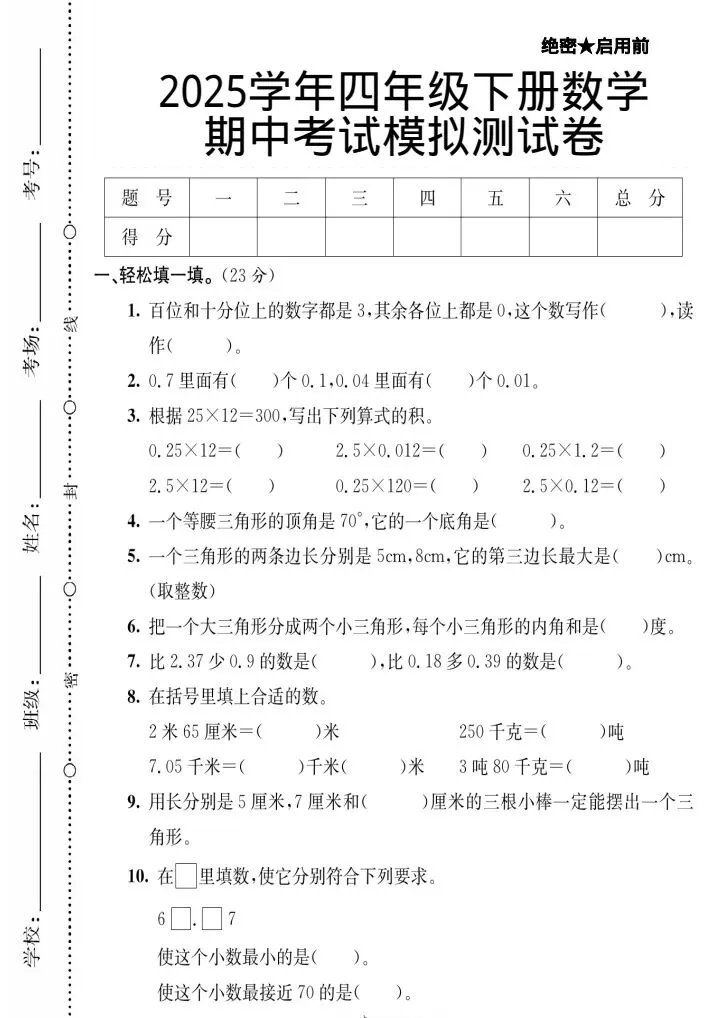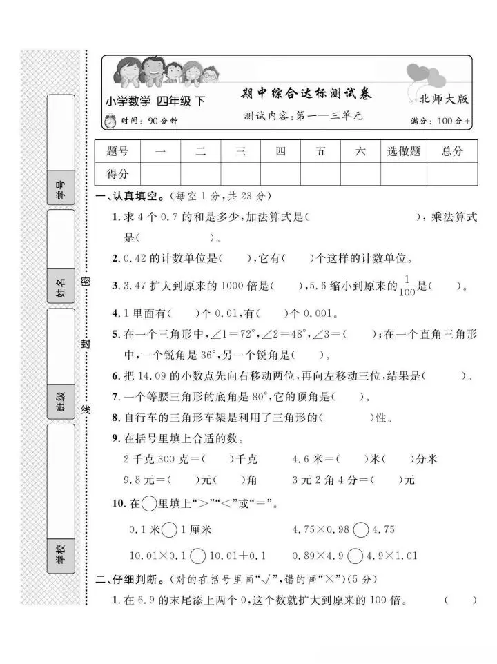 今日份分享四年级下册北师版数学期中测试卷5套含答案(完整电子版可打印)!这份资料已经整理成可打印版本,方便孩子随时翻看学习,建议家长先收藏,再转发给身边有需要的家庭,一起帮助孩子高效学习~