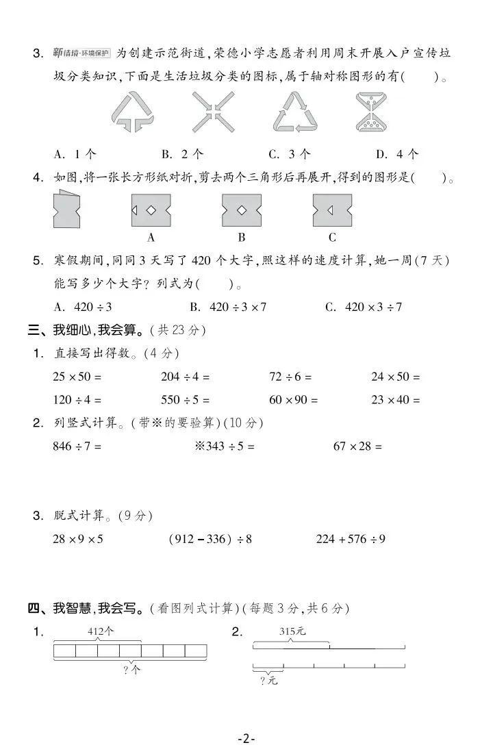 三年级下册北师版数学期中测试卷5套含答案(完整电子版可打印)