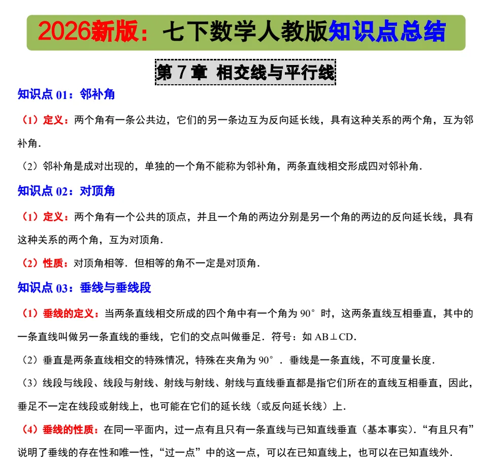 本资料严格依据《义务教育数学课程标准(2022年版)》及广州市现行教材(人教版/北师大版通用适配)整理,覆盖七年级下册全部核心模块,涵盖概念、定理、典型题型与易错提醒,适合日常巩固、单元检测及期末总复习。