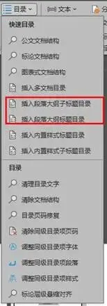 2.第1步把目录基础:文档层级结构设置好了,接下来就非常简单了,还是在【目录】菜单里,直接点击【插入段落大纲子标题目录】、【插入段落大纲标题目录】(会插入1级段落大纲)就可以了。