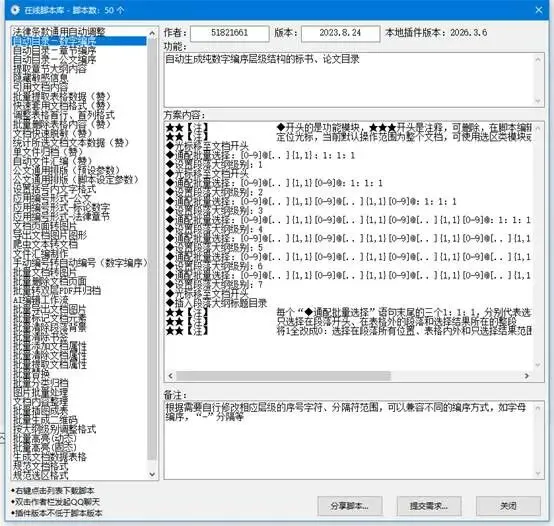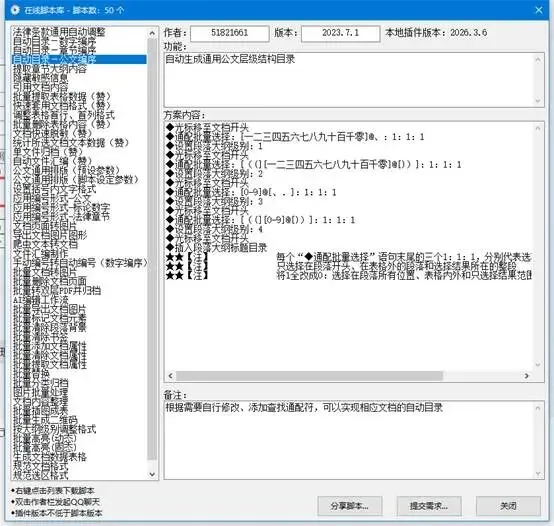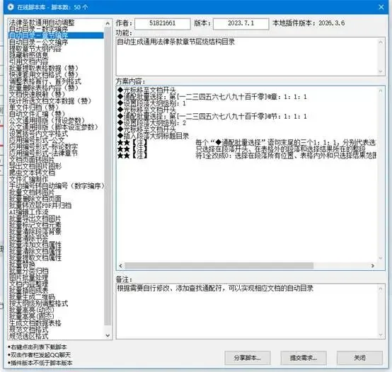 要是你有更特殊的需求,比如针对特定的文档层级结构,比如法律条款的章节编序、公文的特殊编号,标书论文的特殊编号形式,也可以用脚本功能来很简单的做一个自动目录功能,可以实现同样的一键插入目录和清理文字的功能,我们已经给你准备好了现成的脚本,你直接用就行。