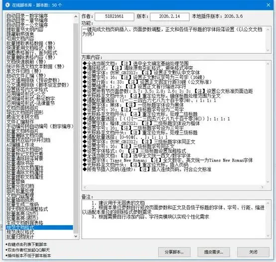 这个脚本是专门用来给整个文档做格式规范的,比如你拿到一份乱七八糟的文档,字体大小不一,行距乱七八糟,点一下这个脚本,它就会自动把整个文档的格式调整成规范的公文格式,标题、正文、行距、段间距,全都给你调好,1分钟搞定你半小时的活。