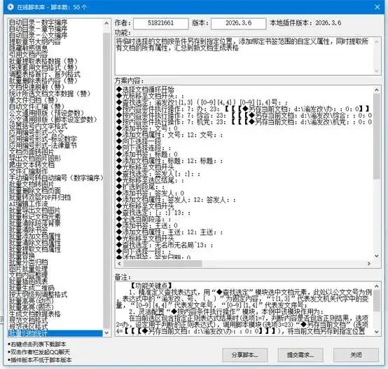 这个是用来批量归档和统计文档数据的的,比如你有一堆文档,要按照类型分类存到不同的文件夹里、要统计文档里特定内容范围的数据,用这个脚本,可以帮你自动分类归档的同时提取文档数据,不用一个个复制粘贴,而且会给这些数据的范围添加书签并且绑定到文档属性,后续如果文档内容有调整,直接用【批量提取文档属性】脚本,就能一键提取生成表格,能节省很多时间。